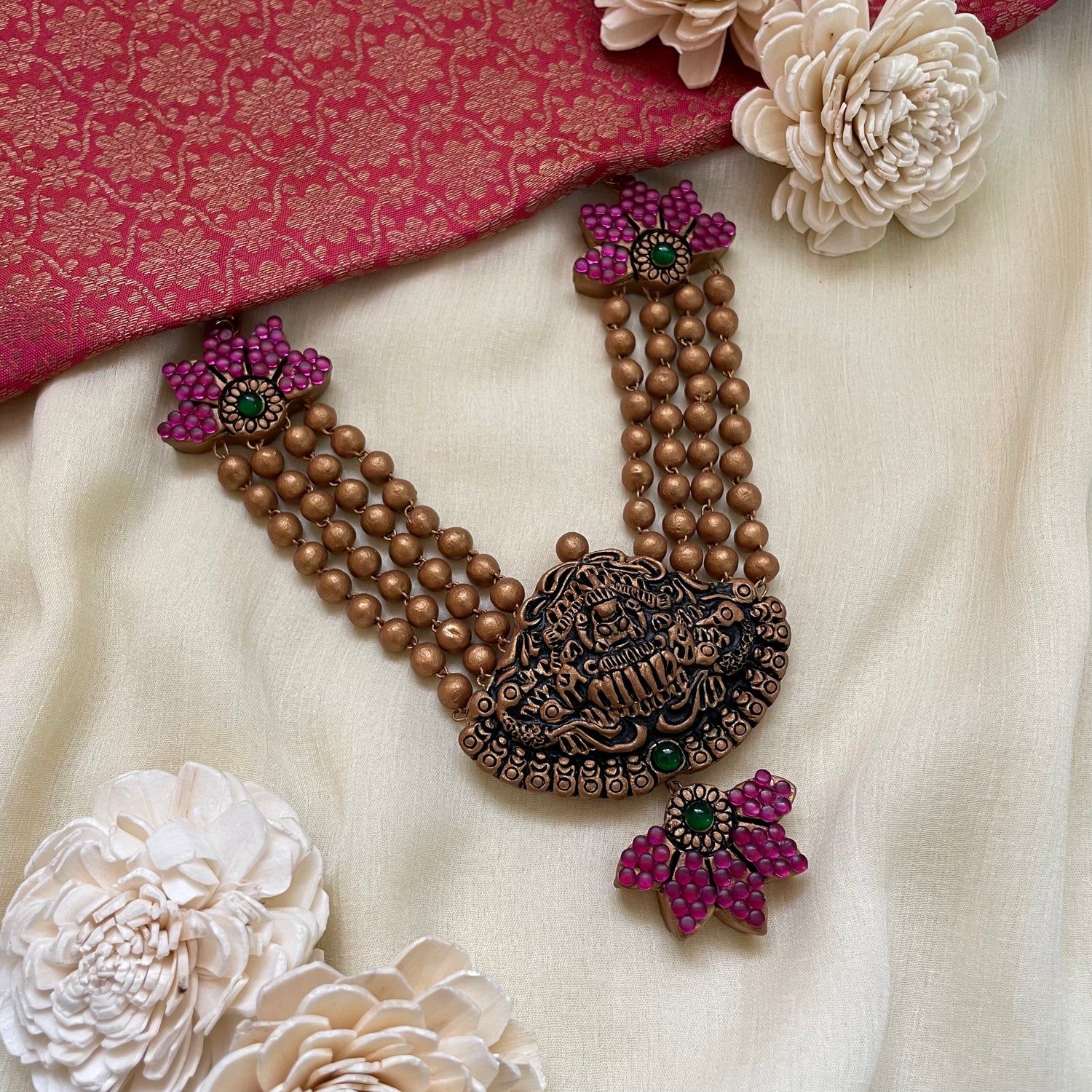 About the product: Shika blended terracotta with kemp stones to get a brilliant new look for your outfit. Kemp stones are semi-precious stones and they dazzle in bright ambiance. What makes this more special is that this is completely handcrafted. Terracotta neckwear with kemp stone embellishments and jhumkas. The neckwear comes with adjustable chain for the closure.