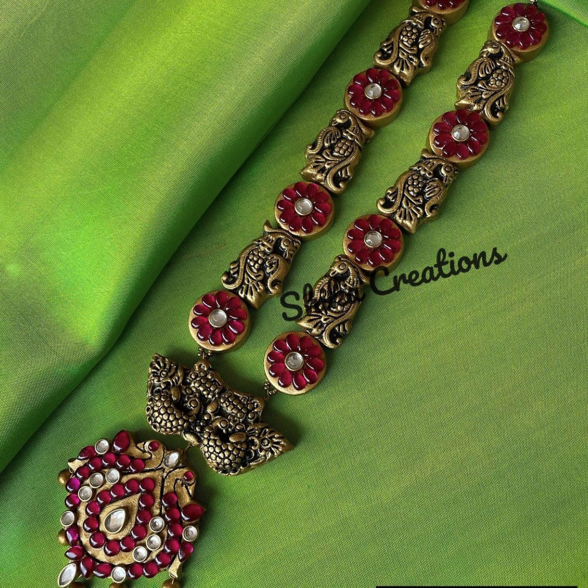 About the Product: Shika blended terracotta with kemp stones to get a brilliant new look for your outfit. Kemp stones are semi-precious stones and they dazzle in bright ambiance. What makes this more special is that this is completely handcrafted. Terracotta neckwear and dangler studs with kemp stone embellishments. The neckwear comes with an adjustable chain for the closure.