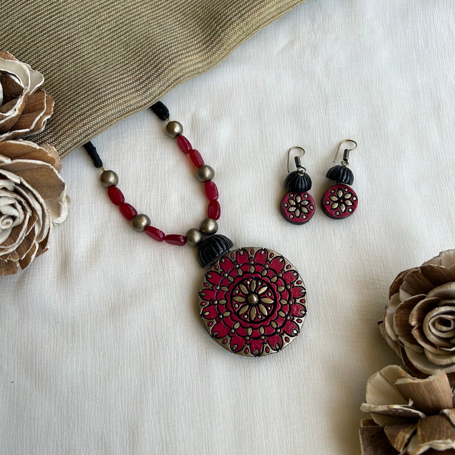 About the Product: Shika's regular wear sets are simple, goes with everything, and can be worn every day to get a sophisticated look. Terracotta pendant with studs in stunning magenta, gold and black shades. The neckwear comes with an adjustable dori for the closure.