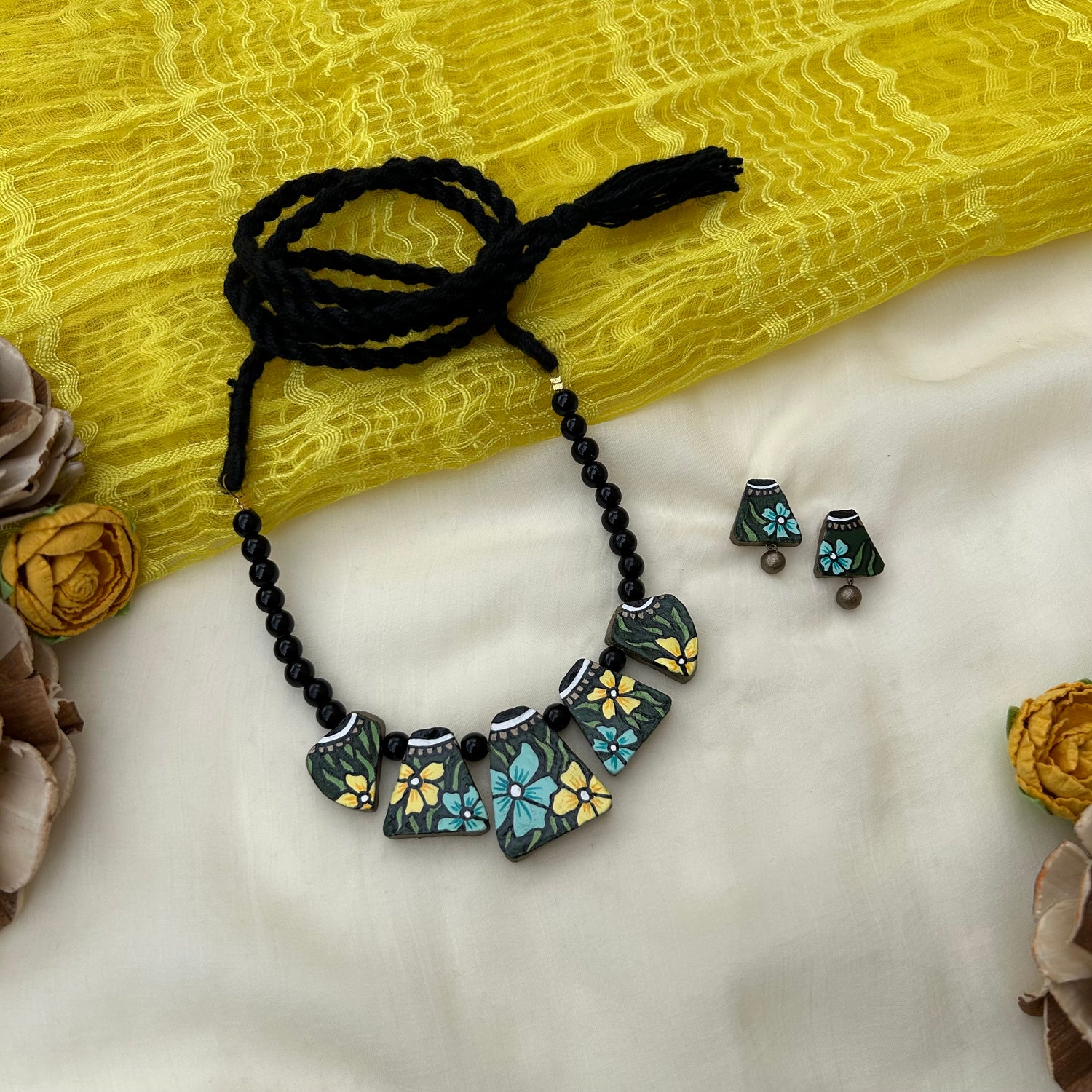 About the Product: Shika's regular wear sets are simple, goes with everything, and can be worn every day to get a sophisticated look. Terracotta pendant with earings in stunning shades. The neckwear comes with an adjustable dori for the closure.
