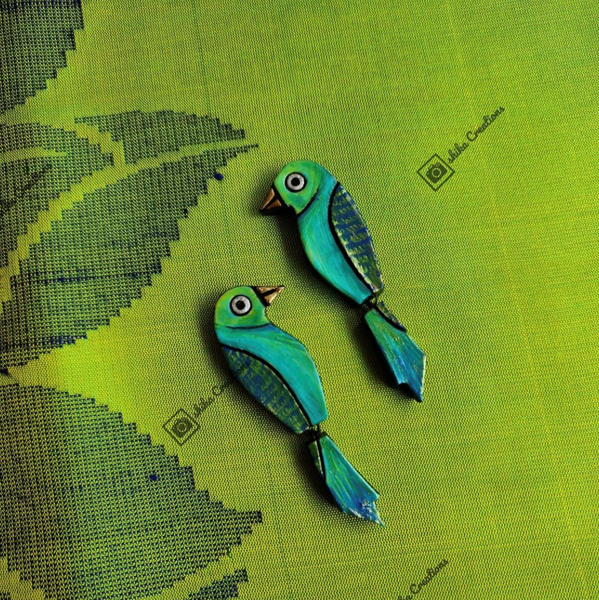 About the Product: Shika's handcrafted danglers are statement earrings that are great for making a powerful impressions. Terracotta parrot danglers in blue green hues.