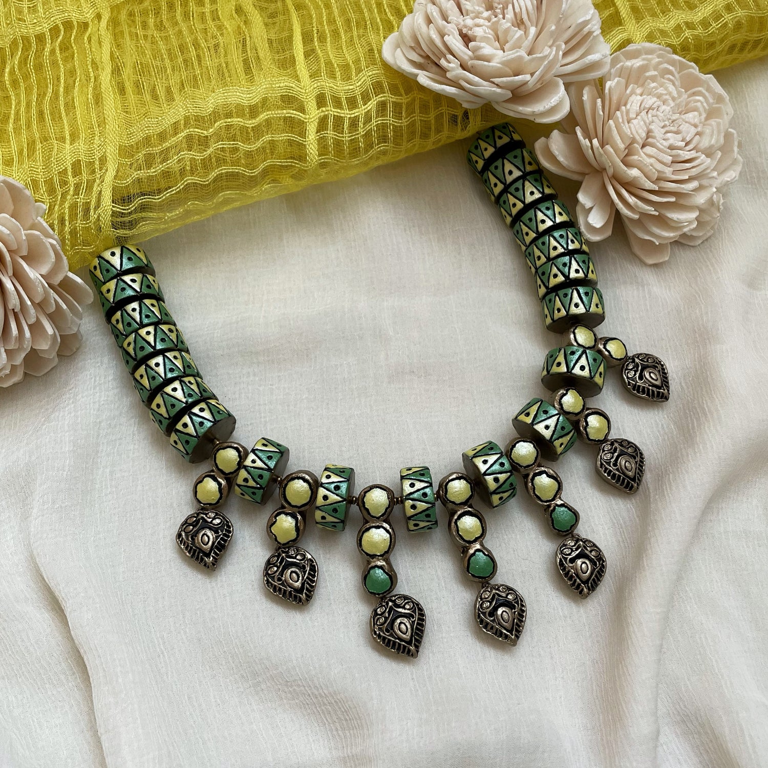 About the Product: This delicate piece of Shika is handcrafted to perfection. Your every moment deserves an elegance and we tune in. Terracotta neckwear with jhumkas in stunning pastels . The neckwear comes with an adjustable dori for the closure.