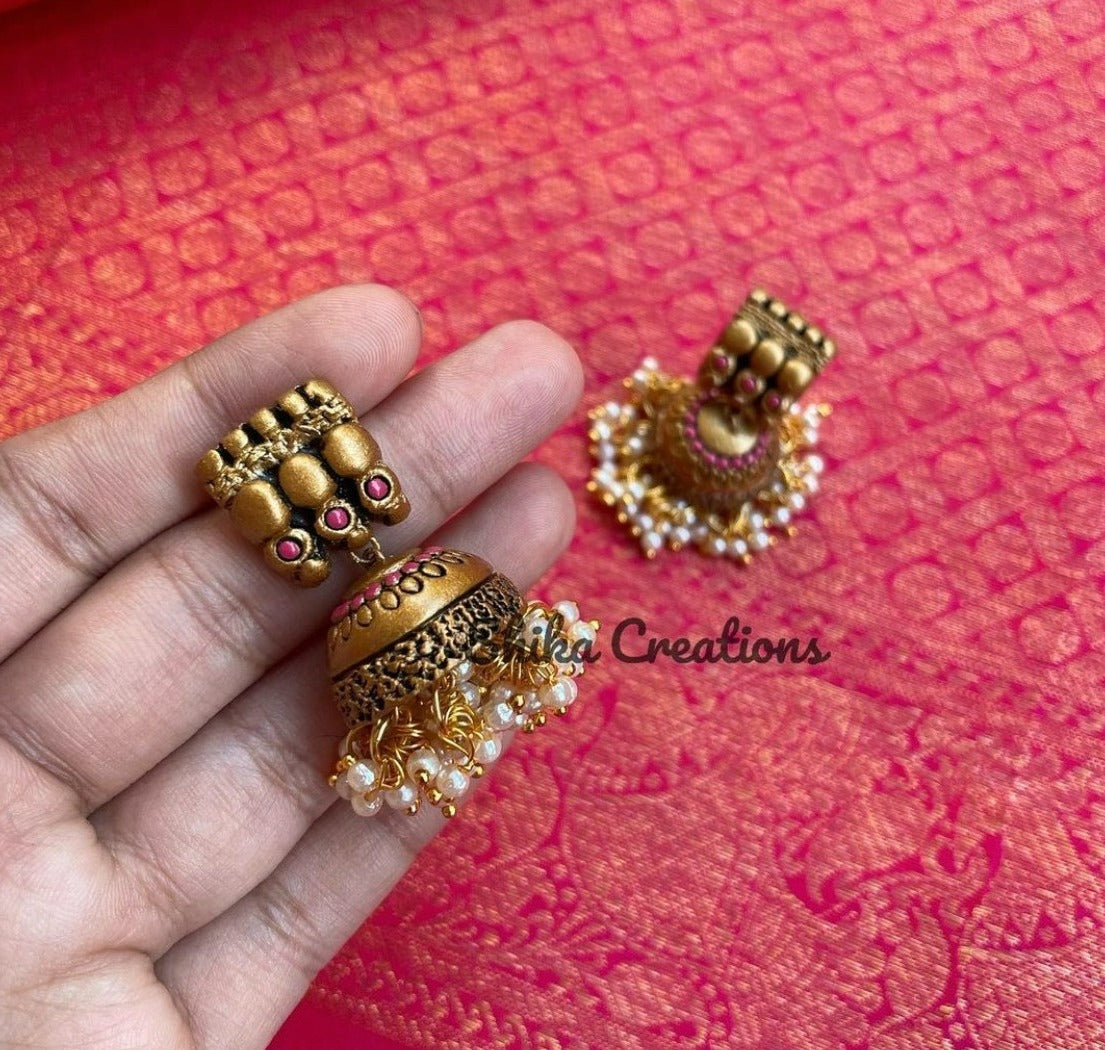 About the Product: You must not be afraid to sparkle a little brighter, darling! Shika handcrafts the terracotta jhumkas with care and perfection. Terracotta jhumkas in antique gold wrap and pearl clusters dangling