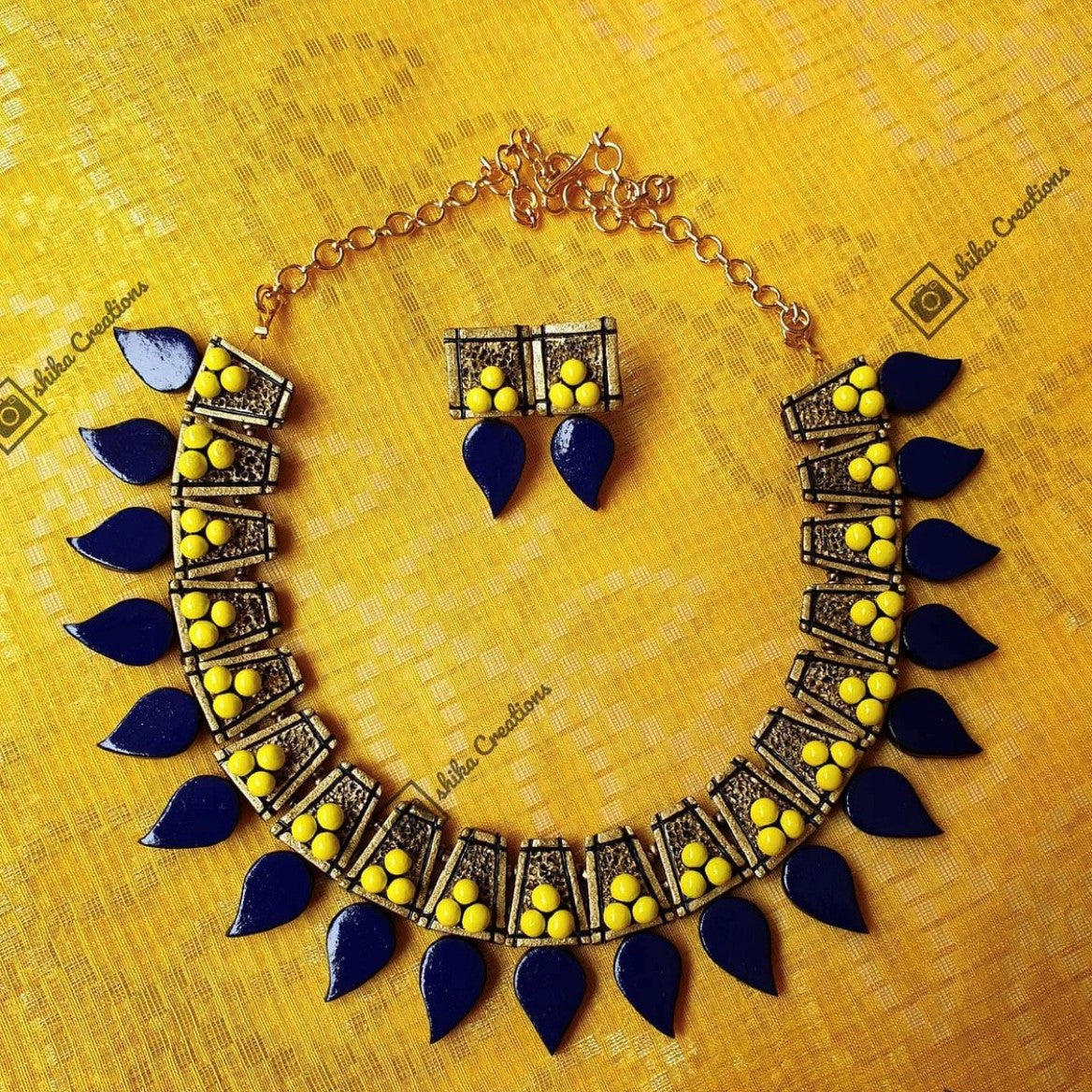 About the Product: This delicate piece of Shika is handcrafted to perfection.Your every moment deserves an elegance and we tune in. terracotta neckwear and studs with yellow and blue hues.The neckwear comes with adjustble chain for the closure.
