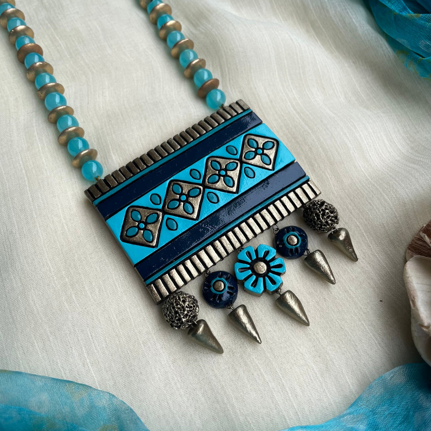 About the Product: Shika's regular wear sets are simple, goes with everything, and can be worn every day to get a sophisticated look. Terracotta daily wear simple pendant with studs in beautiful shades. The neckwear comes with an adjustable dori for the closure.