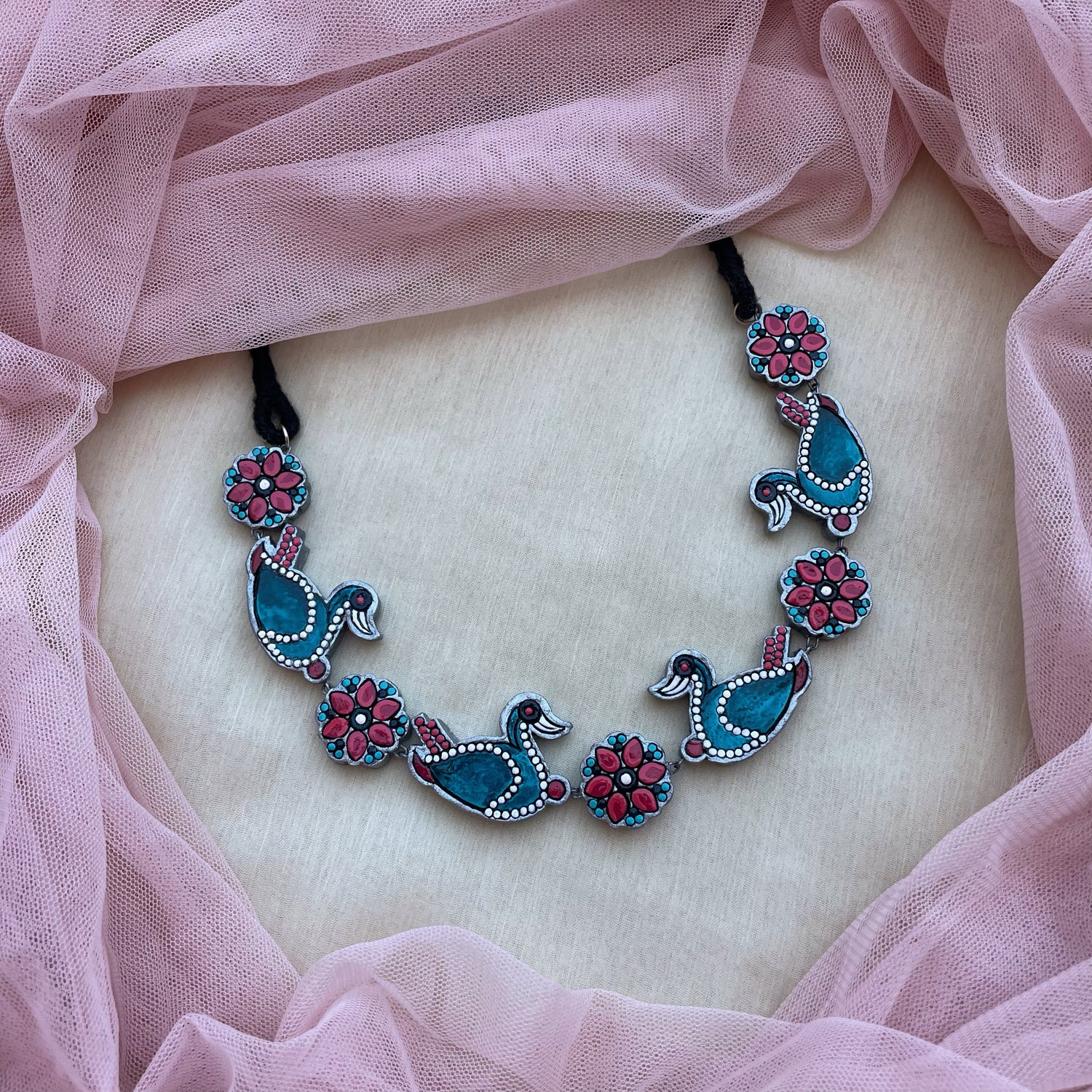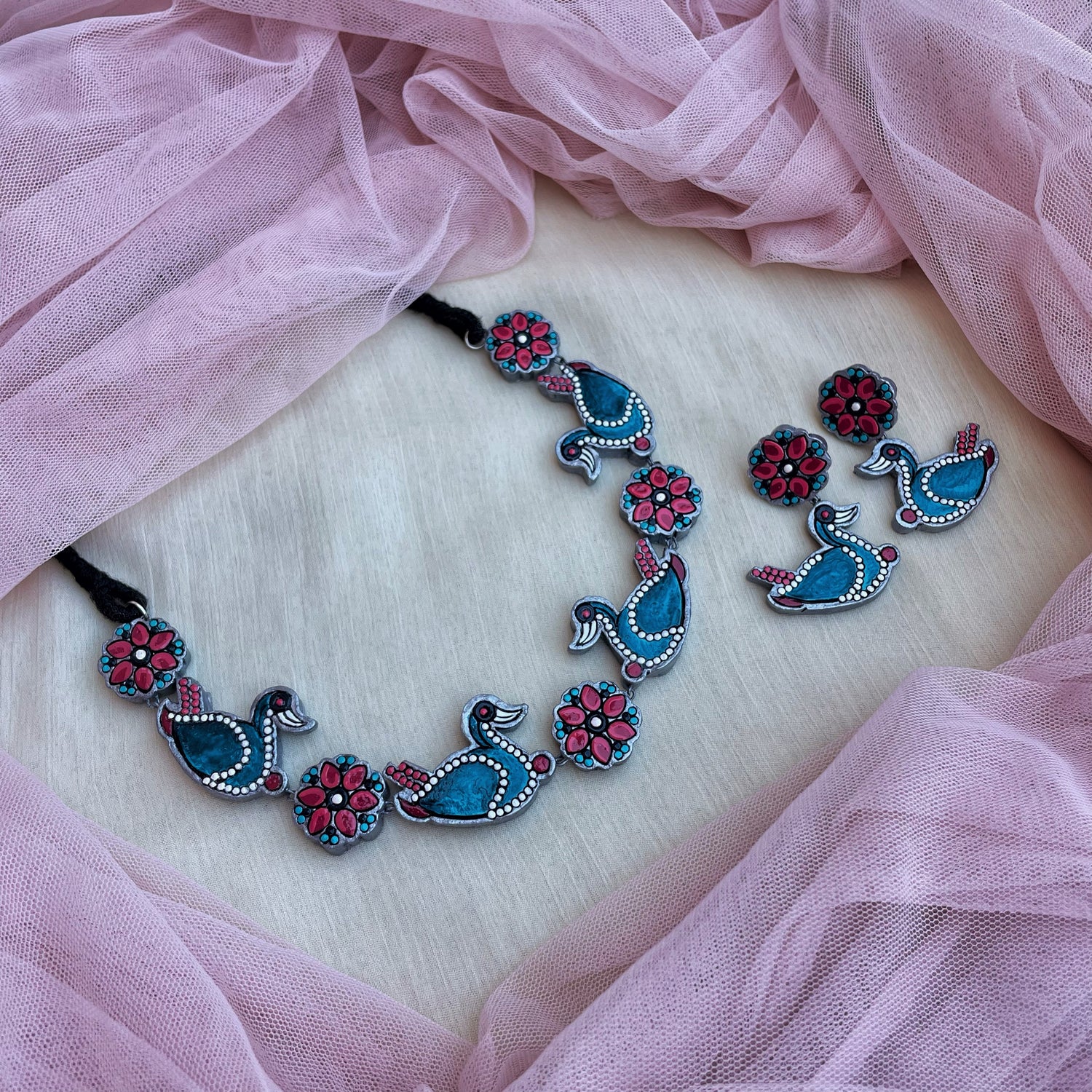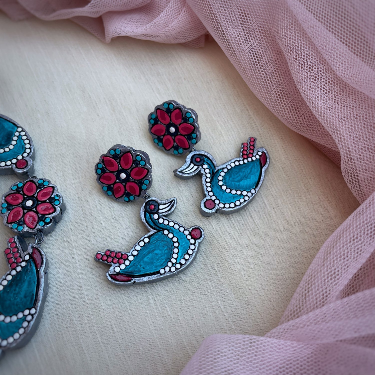 About the Product: This delicate piece of Shika is handcrafted to perfection.Your every moment deserves an elegance and we tune in. Terracotta duck jewellery with a pair of dangler studs in pink and teal shades. The neckwear comes with adjustble dori for the closure.