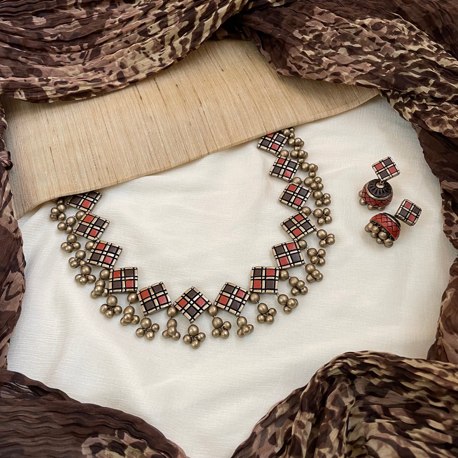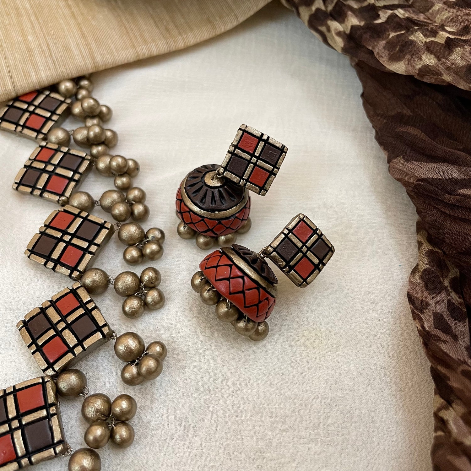 About the Product: This delicate piece of Shika is handcrafted to perfection.Your every moment deserves an elegance and we tune in. Terracotta neckwear with jhumkas in the never-ending brown and marroon shades.The neckwear comes with adjustable thread for the closure.