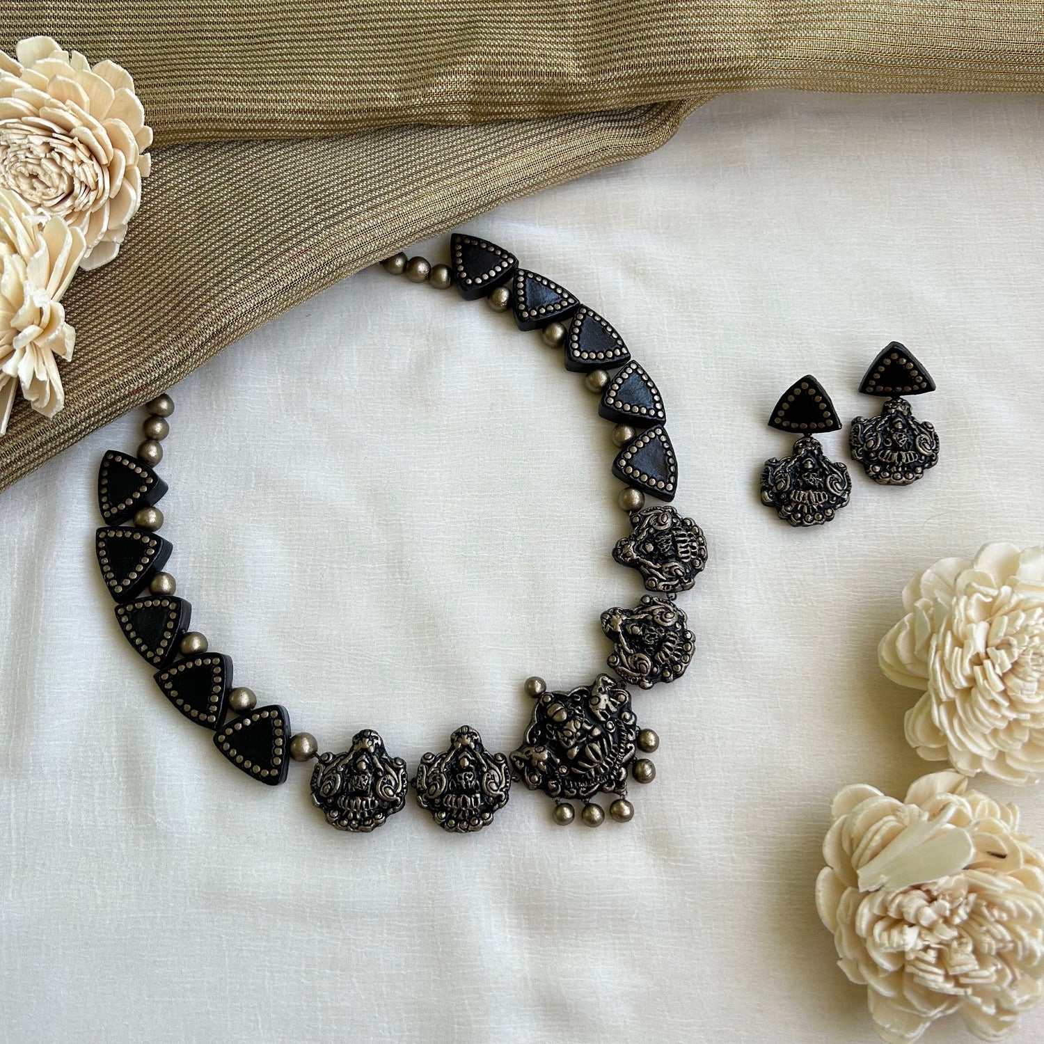 About the Product: This delicate piece of Shika is handcrafted to perfection.Your every moment deserves an elegance and we tune in. Terracotta neckwear with danglers stunning black and gold shades. The neckwear comes with adjustable dori for the closure.