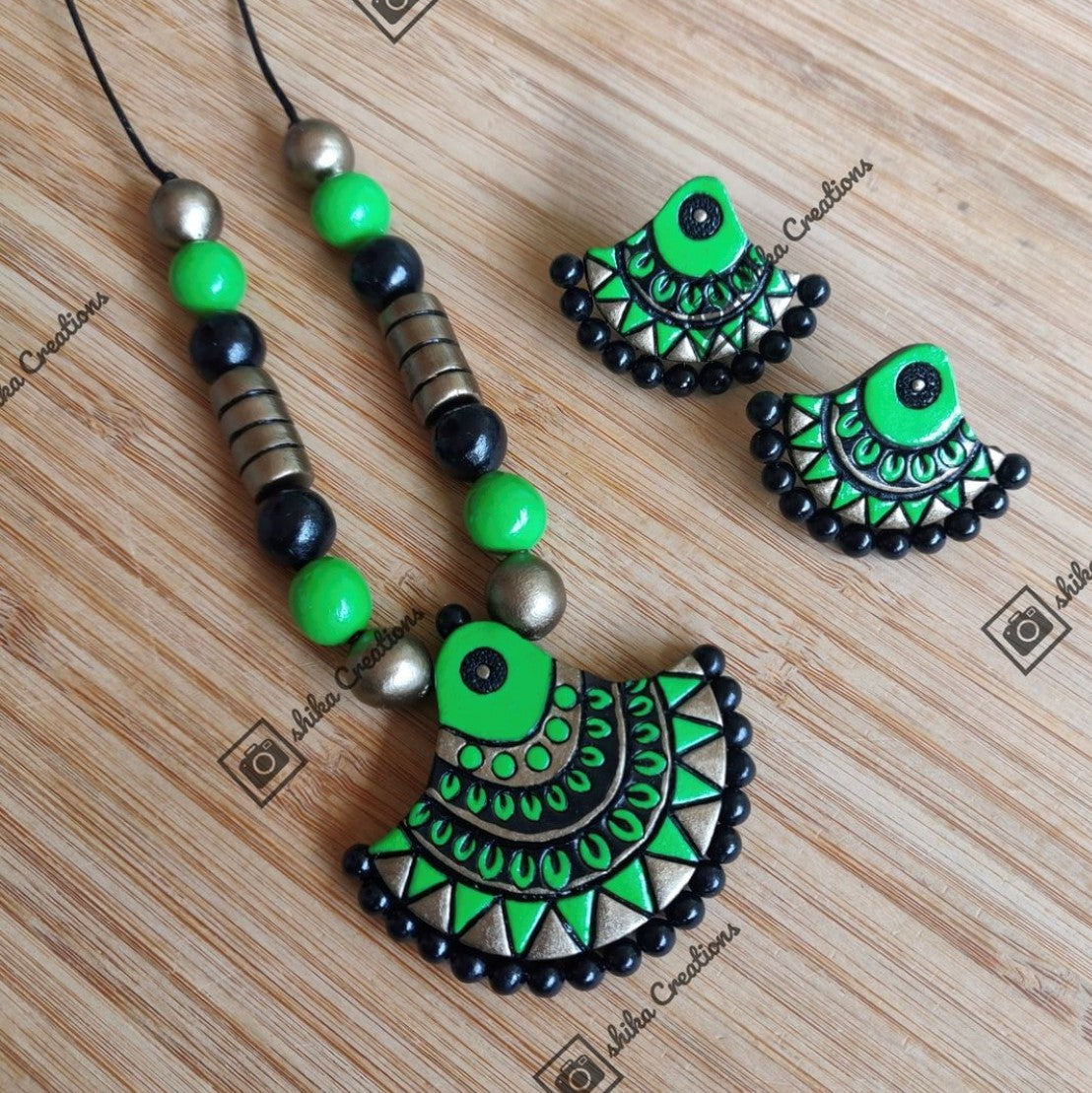 About the Product: Shika's regular wear sets are simple, goes with everything, and can be worn every day to get a sophisticated look. Terracotta pendant with studs in classic green shades.The neckwear comes with an adjustable dori for the closure. .