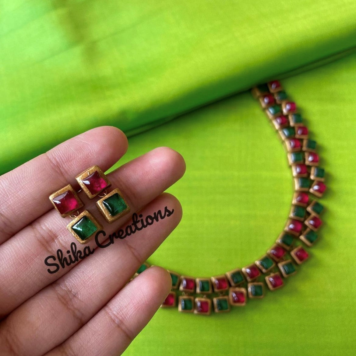 About the Product: Shika blended terracotta with kemp stones to get a brilliant new look for your outfit. Kemp stones are semi-precious stones and they dazzle in bright ambiance. What makes this more special is that this is completely handcrafted. Terracotta two step neckwear and studs with kemp stone embellishments.The neckwear comes with adjustble chain for the closure.