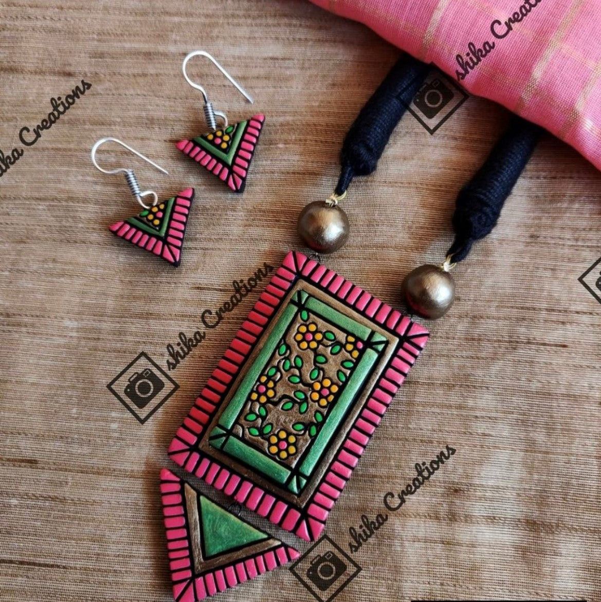 About the Product: Shika's regular wear sets are simple, goes with everything, and can be worn every day to get a sophisticated look. Terracotta pendant with danglers in vibrant shades.The neckwear comes with an adjustable dori for the closure.