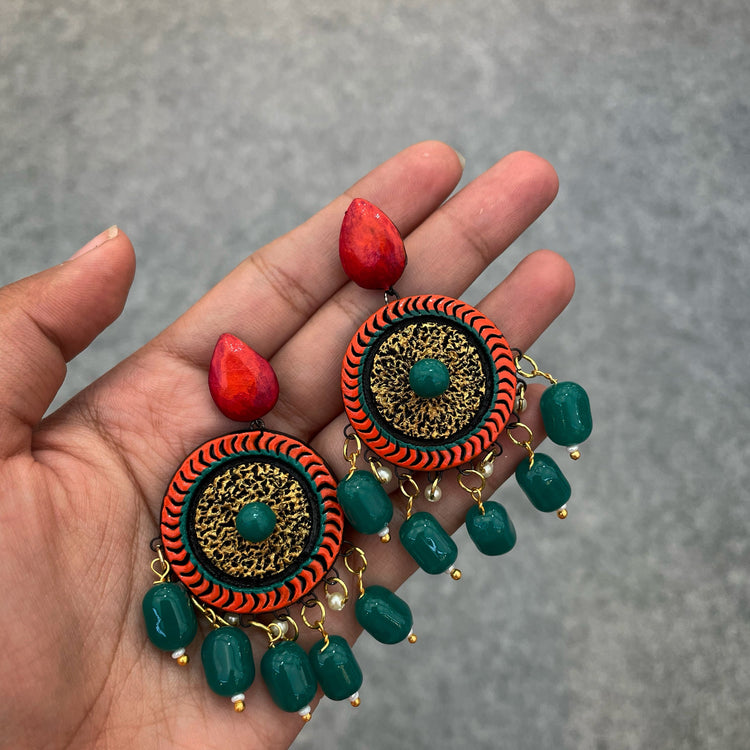 About the Product: Shika's handcrafted chand balis are timeless and look chic despite ever-changing fashions. Terracotta chand bali earrings with stud in turquoise and orange hues.