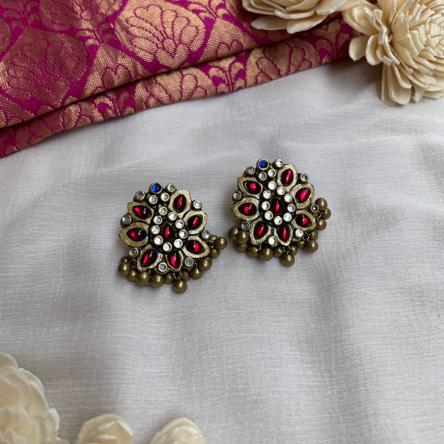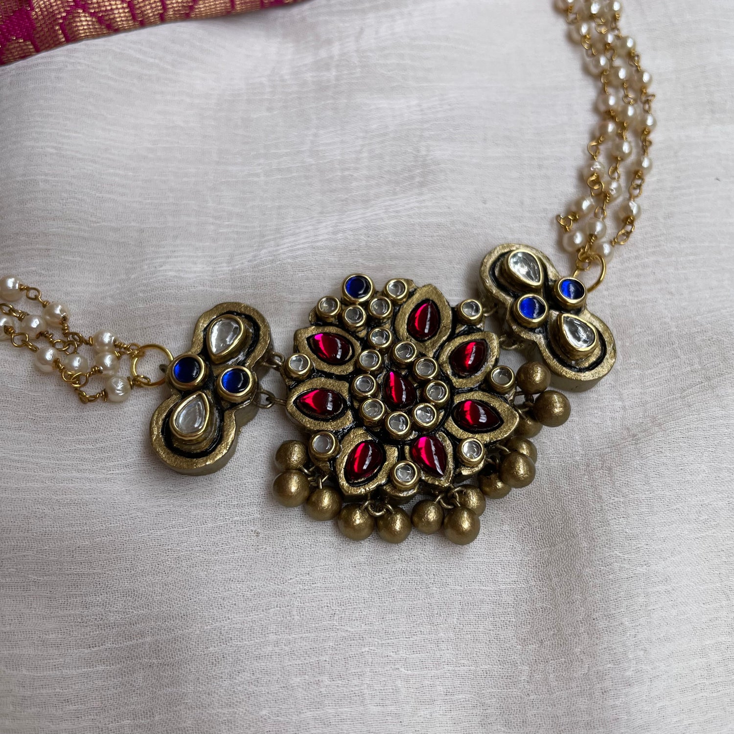About the Product: Shika blended terracotta with kundhans to get a new stunning look for your outfit. What makes this more special is that this is completely handcrafted. Terracotta choker and studs with kundhan stone embellishments sprinkled with terracotta loreals. The neckwear comes with adjustable chain for the closure.