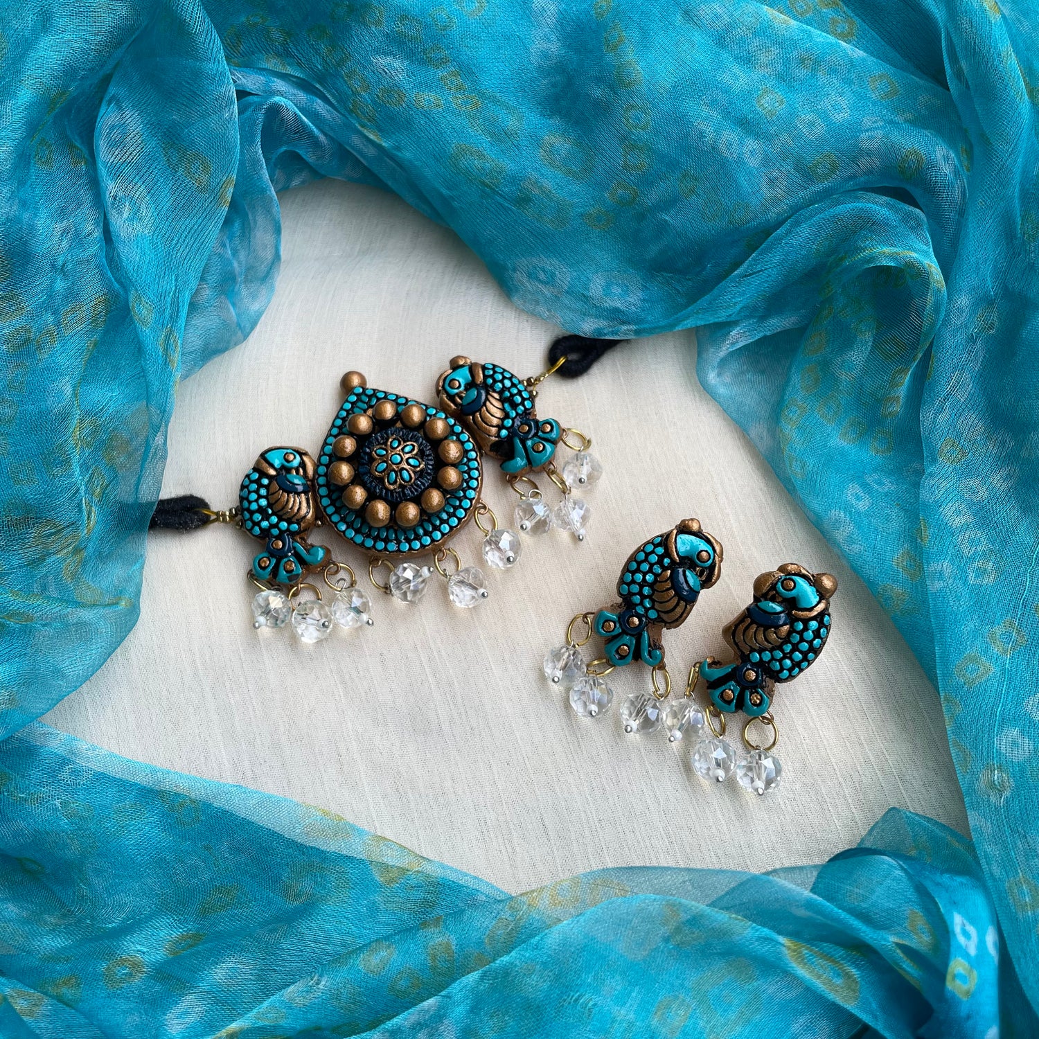 About the Product: Shika handcrafts each and every piece with love and perfection. Utmost care is taken in carving each terracotta piece. Terracotta choker with studs in teal and gold shades. The neckwear comes with an adjustable dori for the closure.
