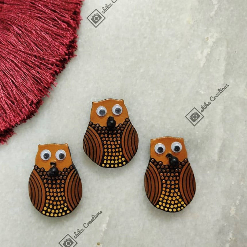 About the Product: Shika's handcrafted home decors are an epitome of creativity and innovation. Terracotta dangling owl fridge magnet.