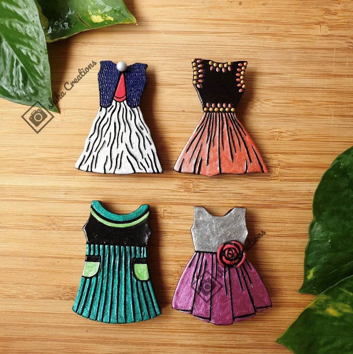 About the Product: Shika's handcrafted home decors are an epitome of creativity and innovation. Terracotta frock fridge magnets in beautiful hues.