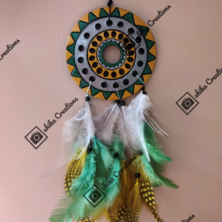 About the Product: Shika's handcrafted home decors are an epitome of creativity and innovation. Terracotta dreamcatchers with terracotta loop and feathers. the dream catcher comes with an adjustable nylon thread to hang.