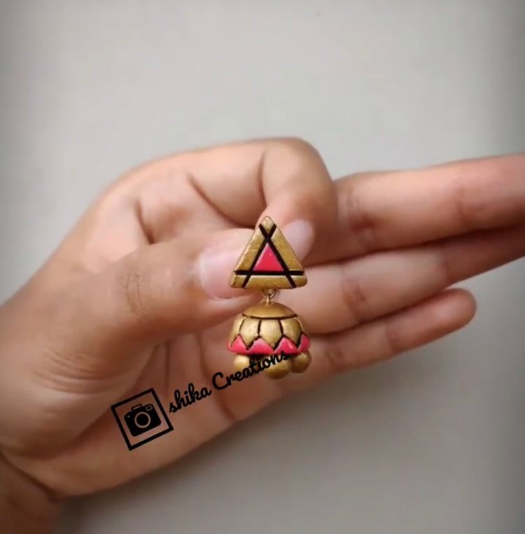 About the Product: You must not be afraid to sparkle a little brighter, darling! Shika handcrafts the terracotta jhumkas with care and perfection. Terracotta jhumkas in pink and gold hues.