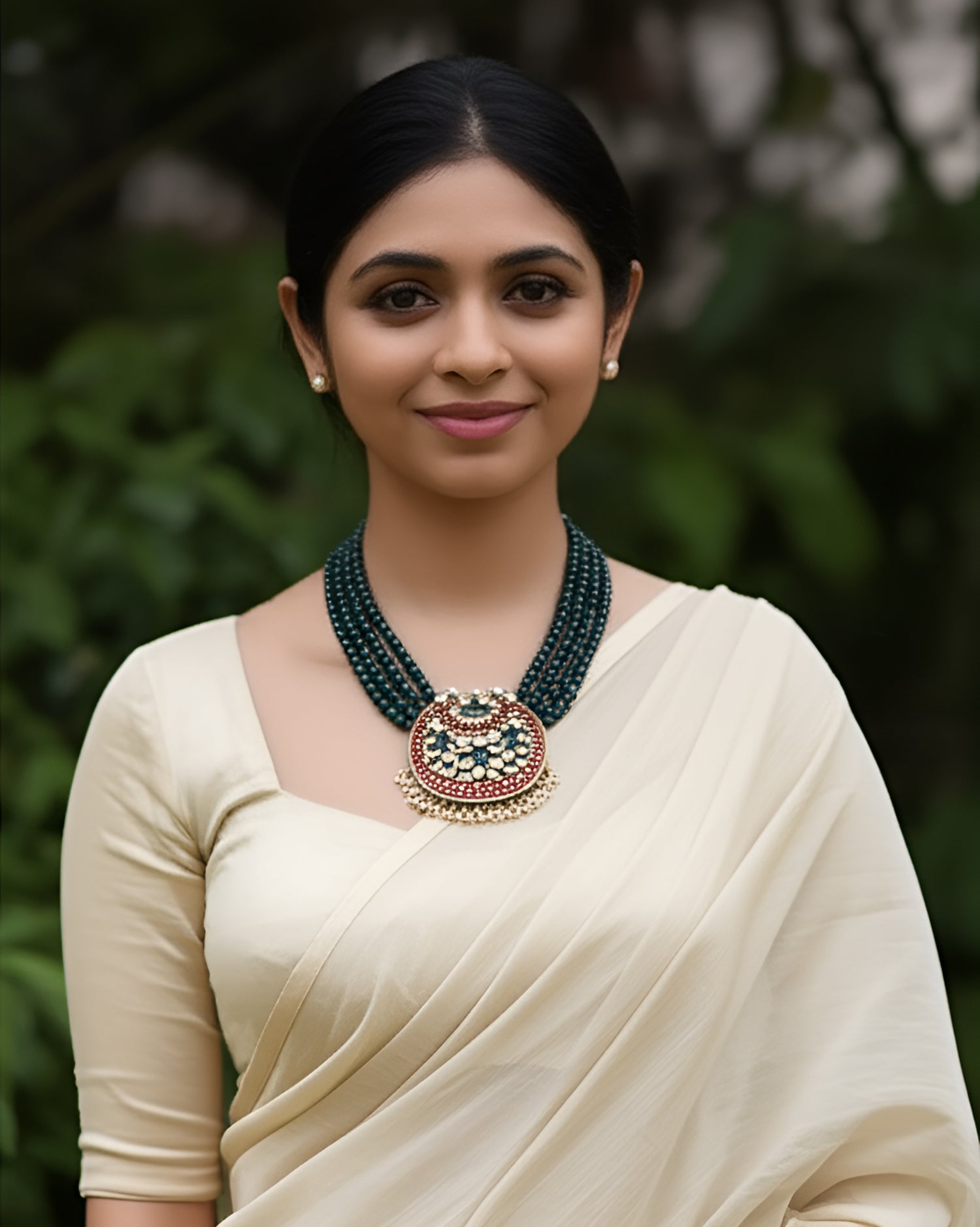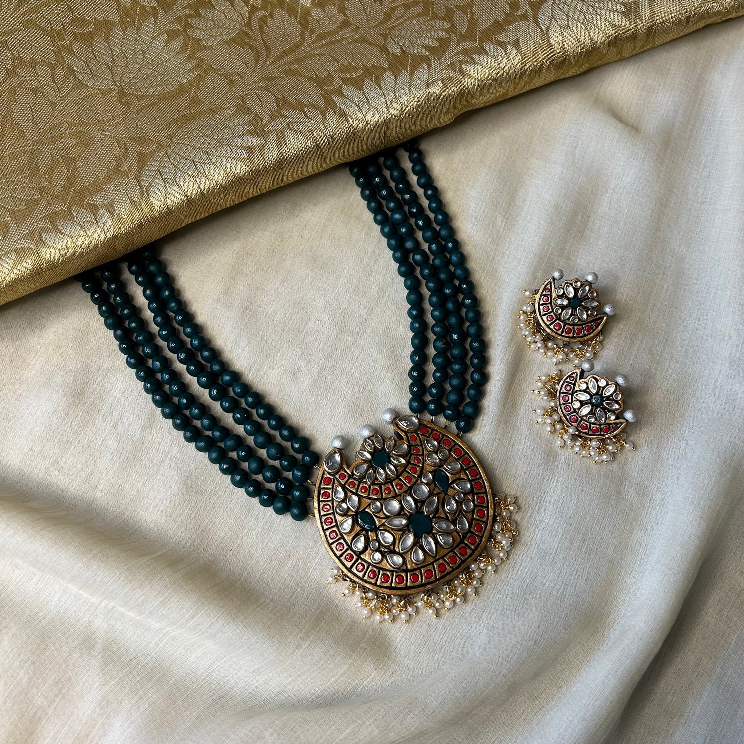 About the Product: This delicate piece of Shika is handcrafted to perfection.Your every moment deserves an elegance and we tune in. Terracotta neckwear with studs in the charming antique gold with kundhan stone embellishments.The neckwear comes with adjustable thread for the closure.