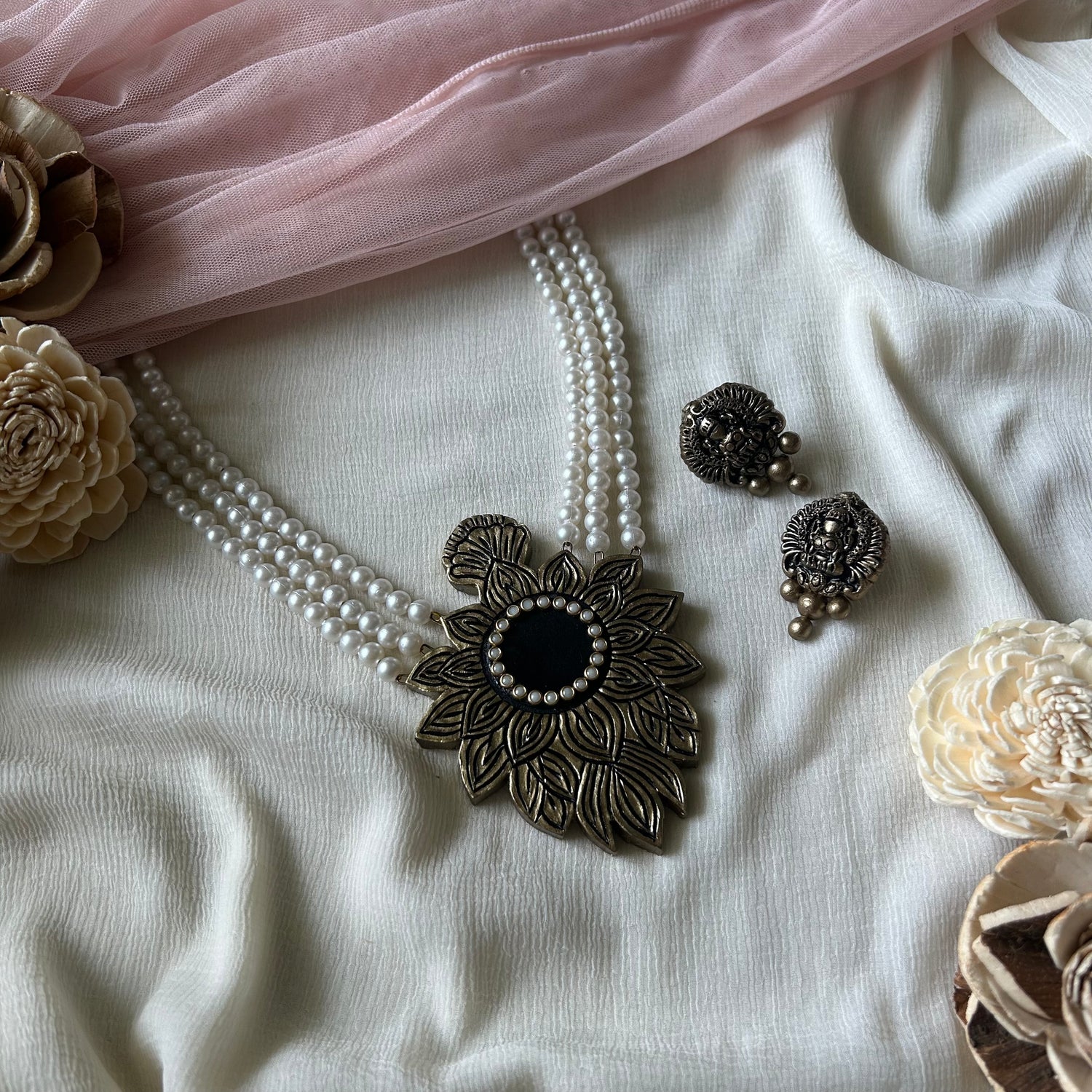 About the Product: This delicate piece of Shika is handcrafted to perfection.Your every moment deserves an elegance and we tune in. Terracotta neckwear with danglers in the endless black and gold shades with kundhan stone embellishments.The neckwear comes with adjustable thread for the closure.