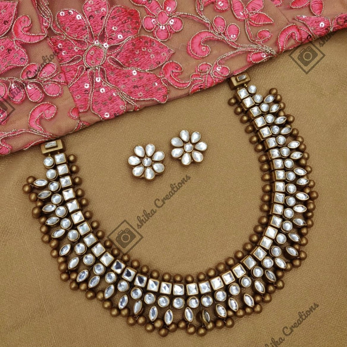About the Product: Shika blended terracotta with kundhans to get a new stunning look for your outfit. What makes this more special is that this is completely handcrafted. Terracotta neckwear and studs with kundhan stone embellishments to suit to any ethnic and traditional outfit. The neckwear comes with adjustble chain for the closure.