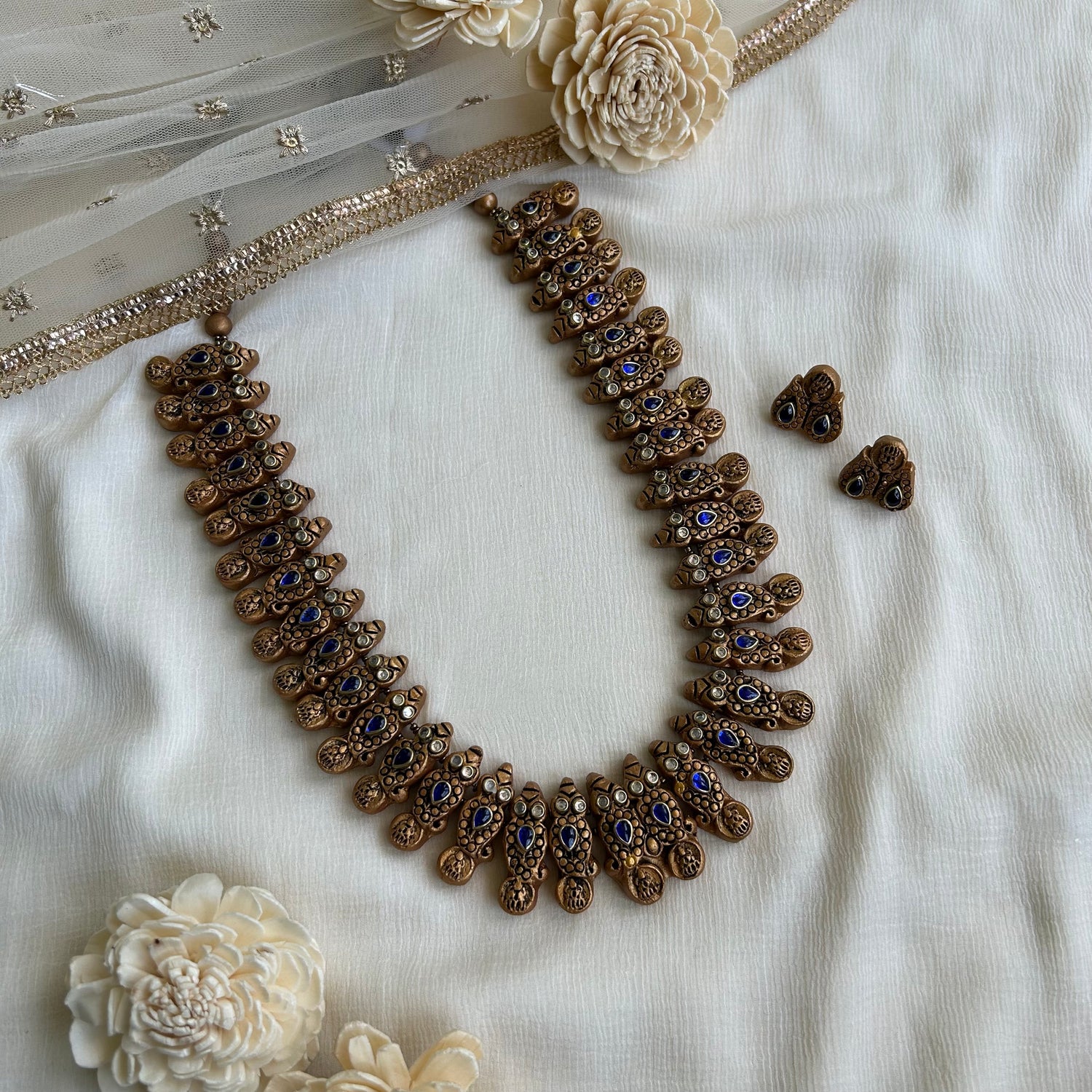 About the Product: This delicate piece of Shika is handcrafted to perfection.Your every moment deserves an elegance and we tune in. Terracotta neckwear with studs in a golden wrap with Kundhan stones embellishments.The neckwear comes with adjustable thread for the closure.