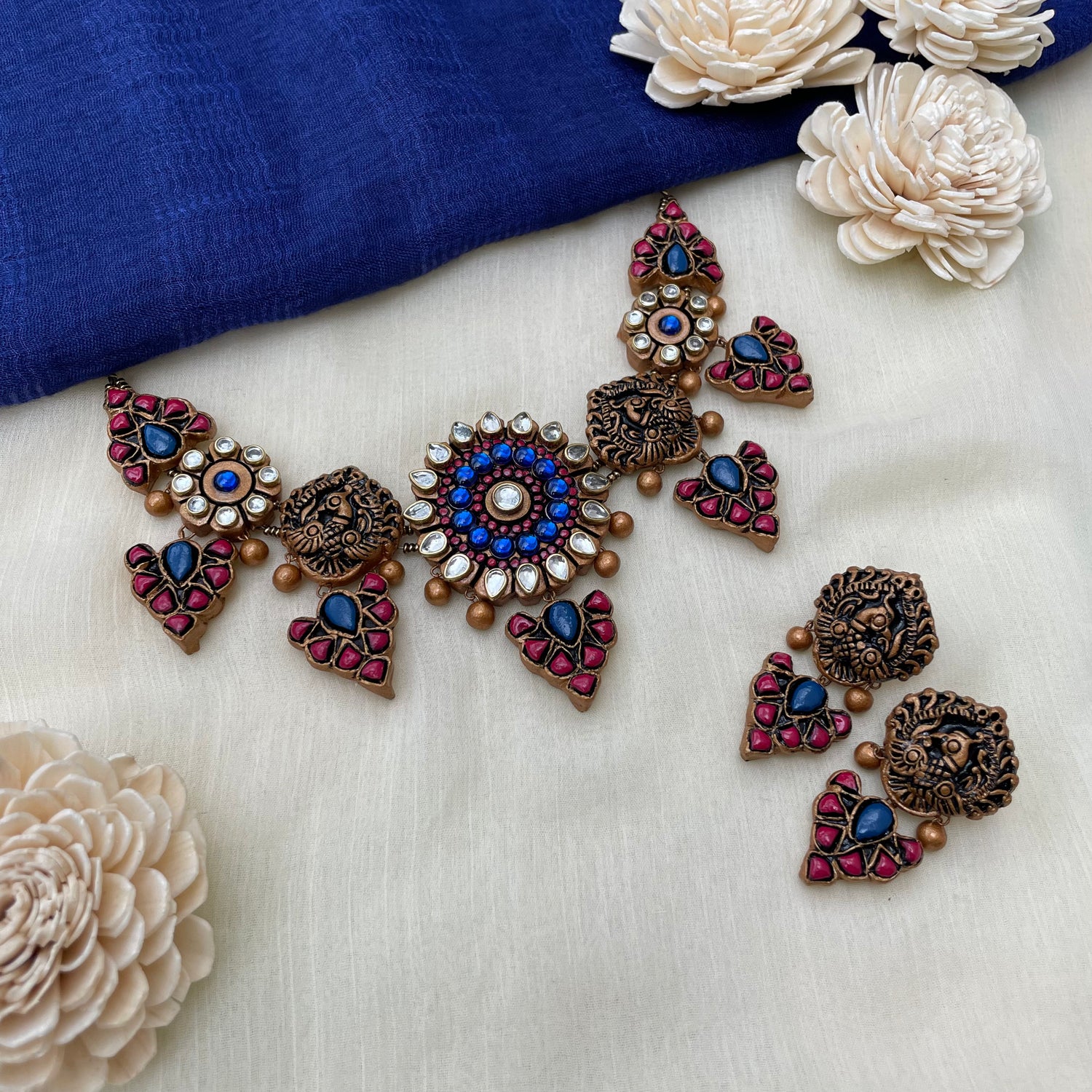 About the product - Signatures of Shika! Terracotta neckwear in stunning hues with kundhan stone embellishments . It is paired with jhumkas and danglers. The set comes with an adjustable thread for the closure.
