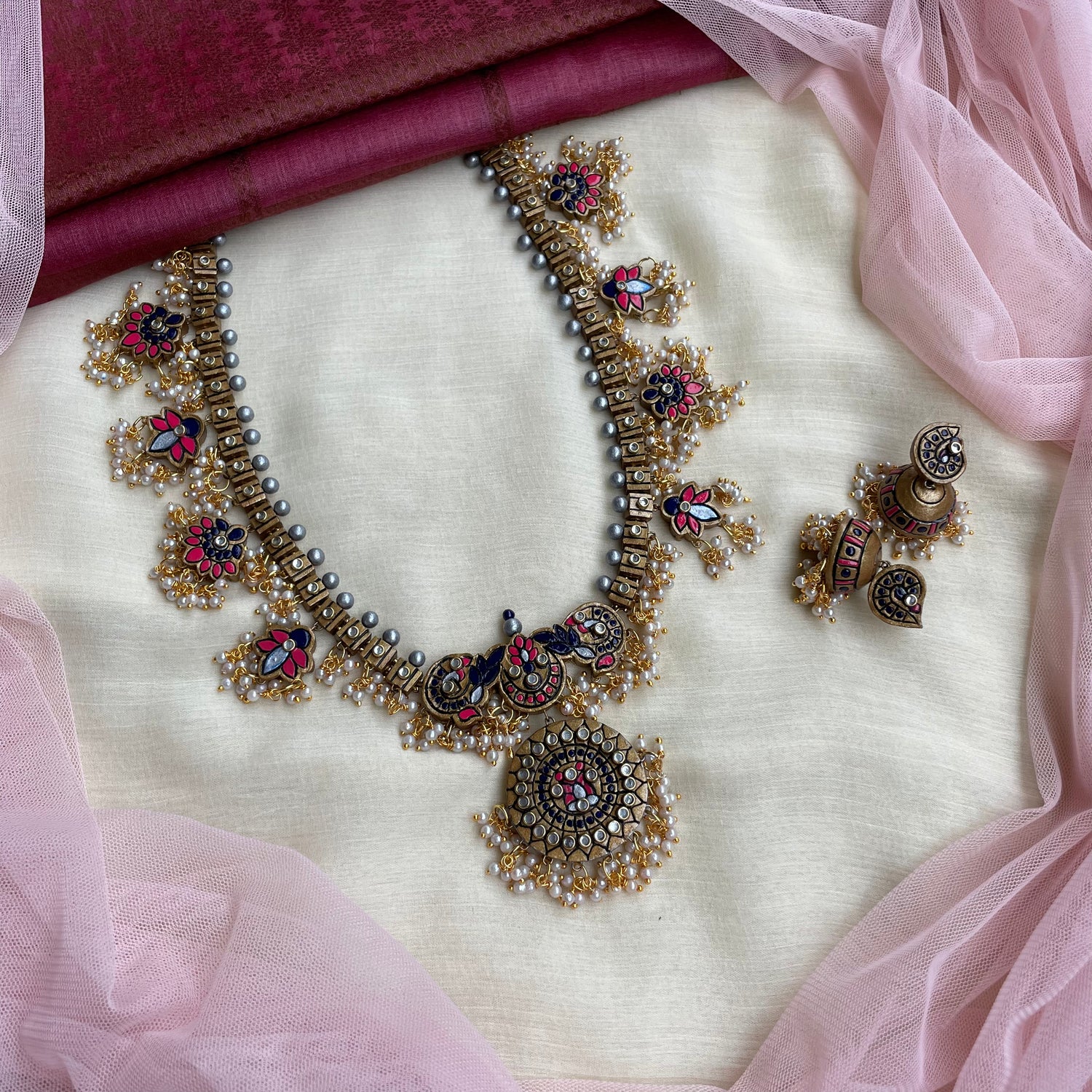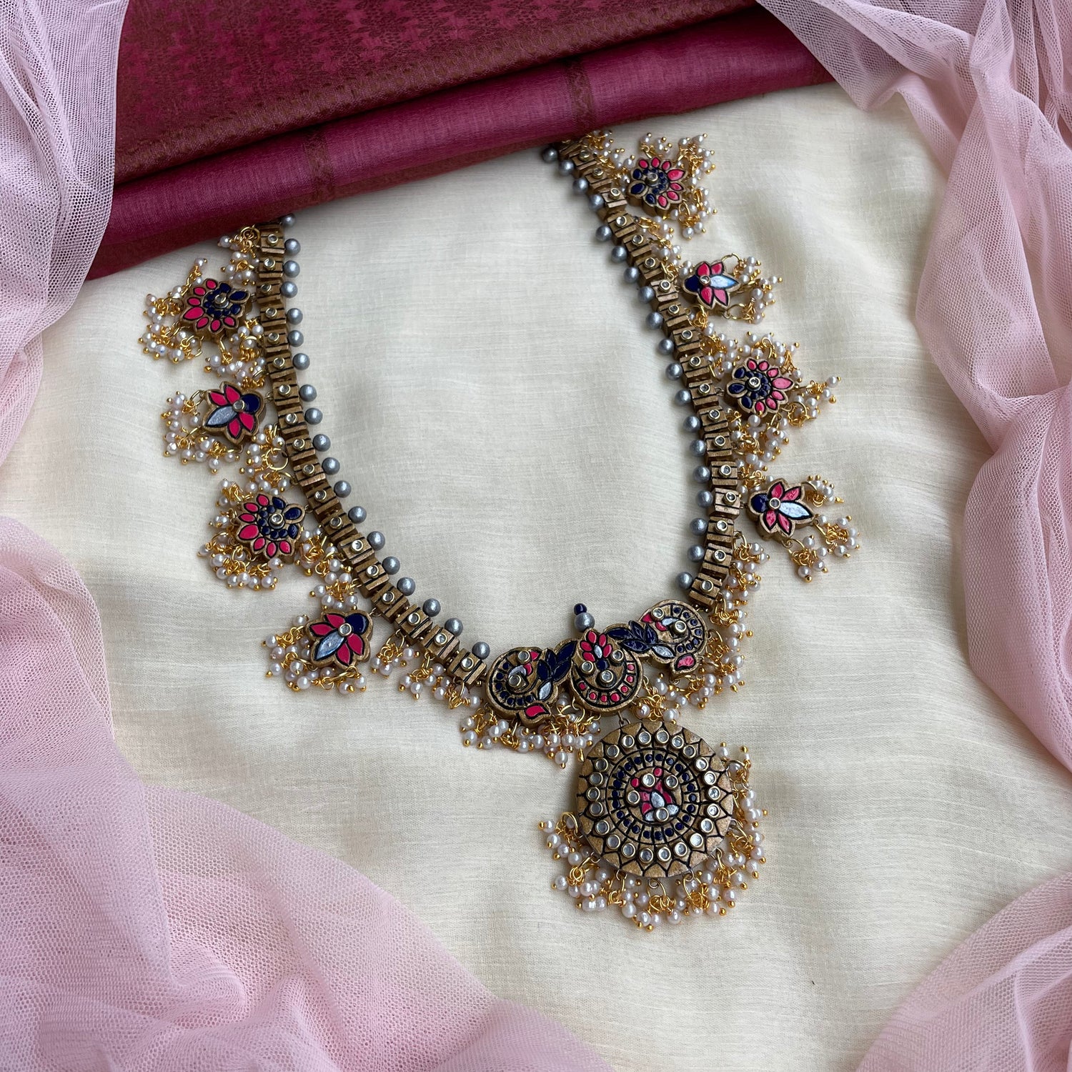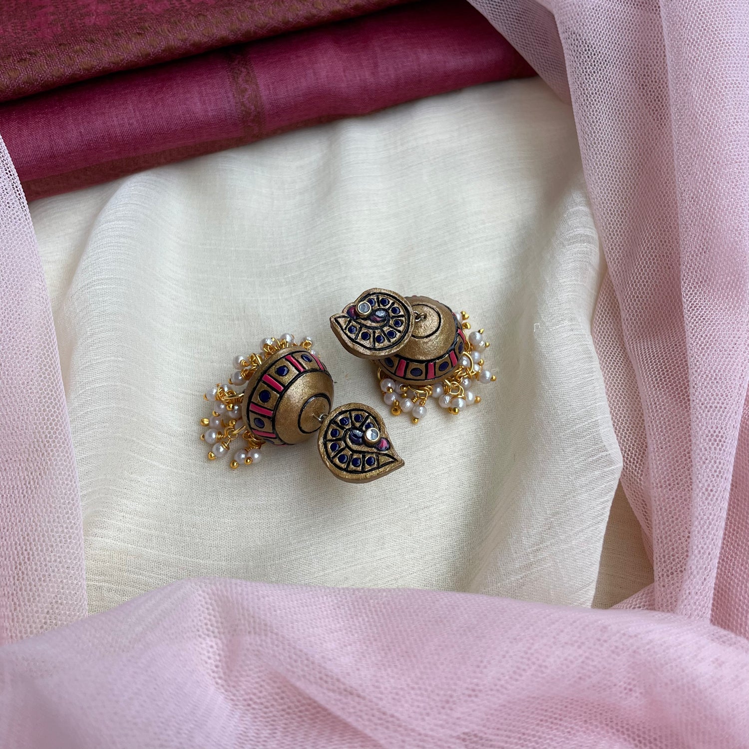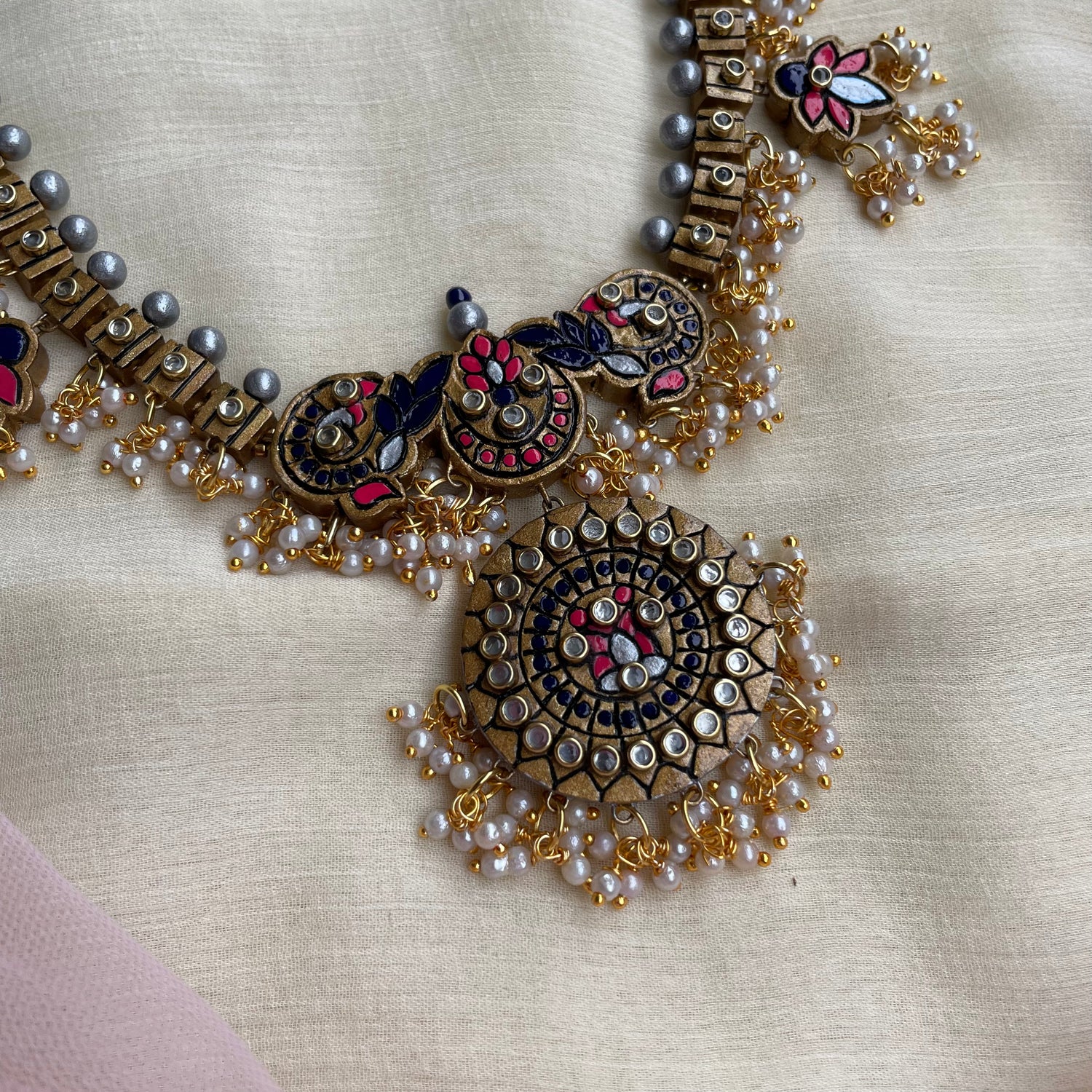 About the Product: This delicate piece of Shika is handcrafted to perfection.Your every moment deserves an elegance and we tune in. Terracotta neckwear with jhumkas in the endless gold shades with kundhan stone and Pearl embellishments.The neckwear comes with adjustable thread for the closure.