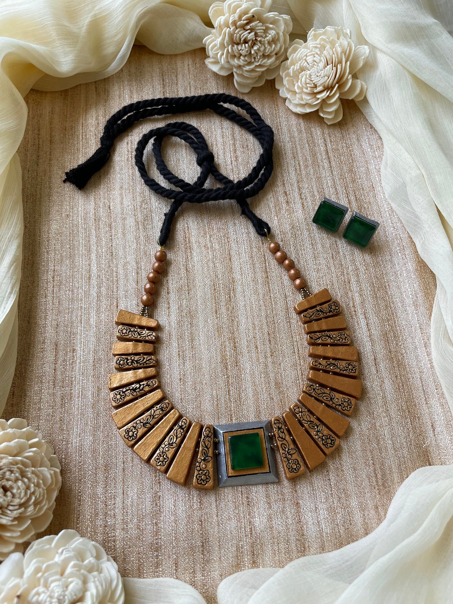 About the product - Signatures of Shika! Terracotta neckwear in stunning hues . It is paired with studs. The set comes with an adjustable thread for the closure.