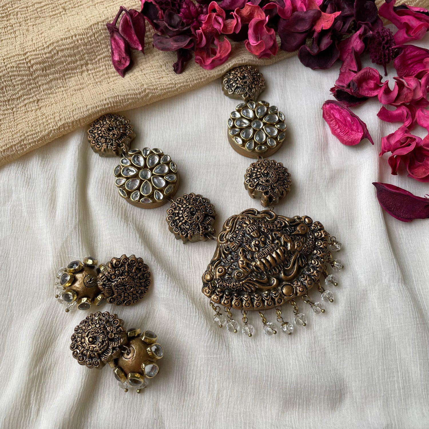 About the product - Signatures of Shika! Terracotta neckwear in stunning hues . It is paired with jhumkas. The set comes with an adjustable thread for the closure.