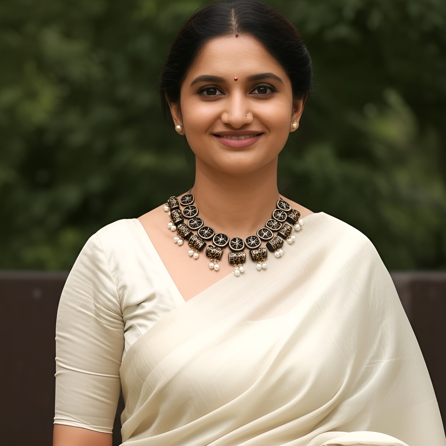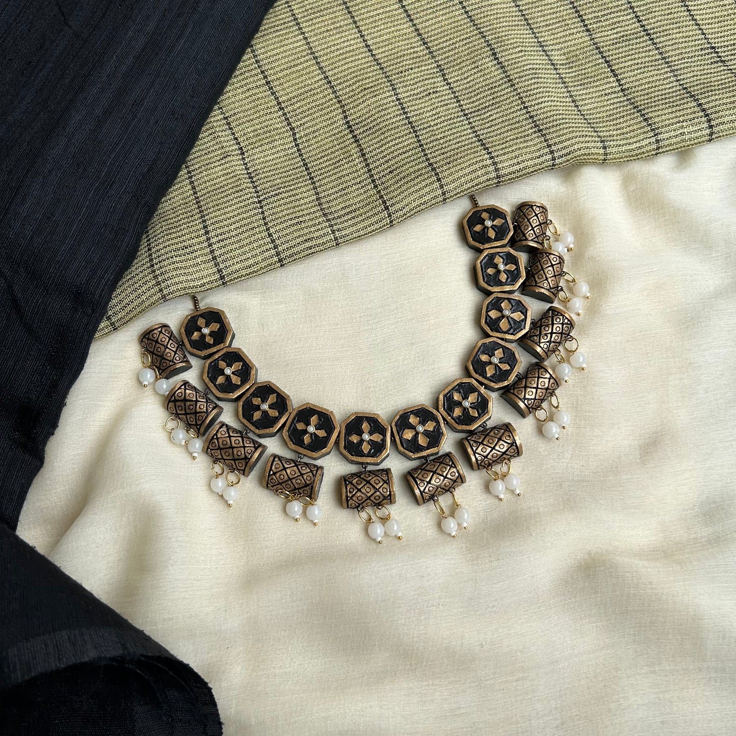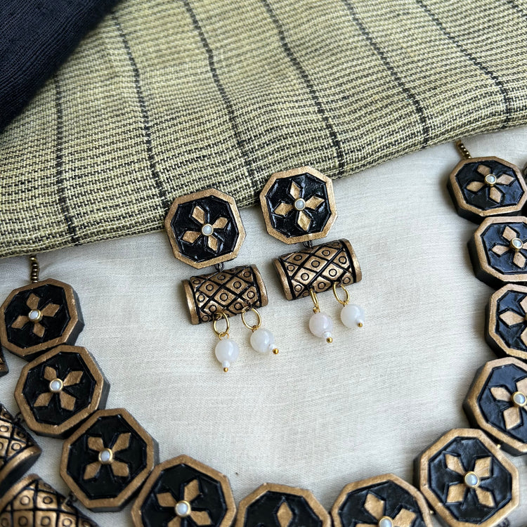 About the Product: This delicate piece of Shika is handcrafted to perfection.Your every moment deserves an elegance and we tune in. Terracotta neckwear with danglers in the charming antique gold and black with kundhan stone embellishments.The neckwear comes with adjustable thread for the closure.
