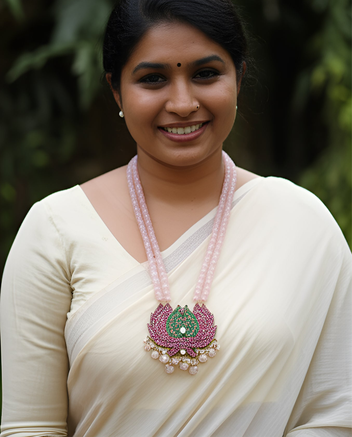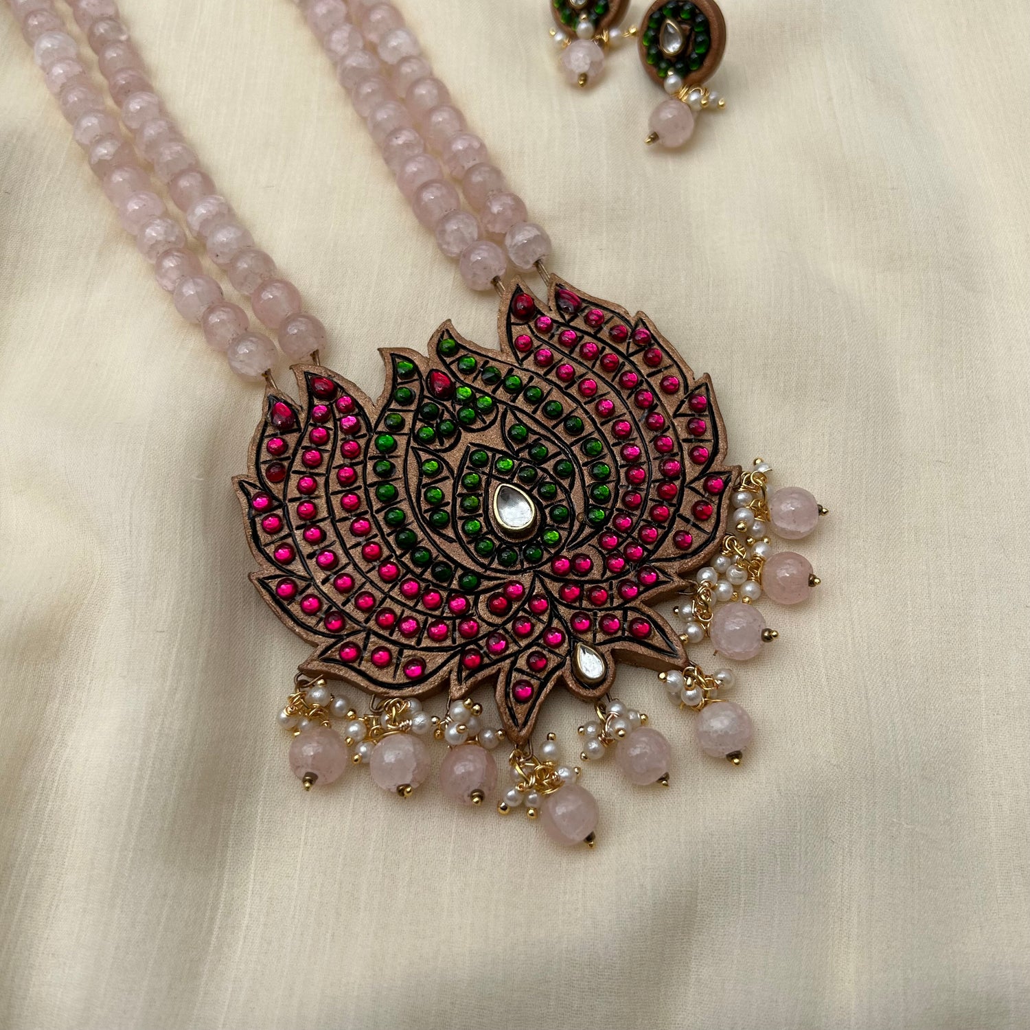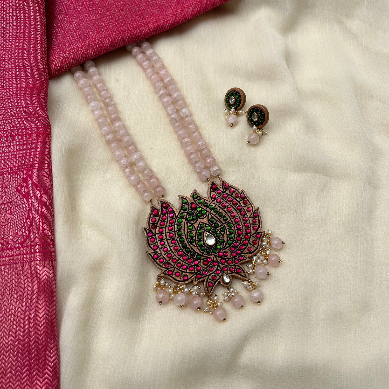 About the Product: This delicate piece of Shika is handcrafted to perfection.Your every moment deserves an elegance and we tune in. Terracotta lotus neckwear with studs in pink and green shades in a golden wrap.The neckwear comes with adjustable thread for the closure.