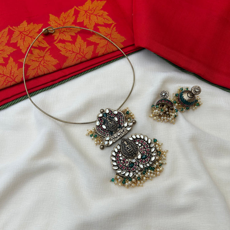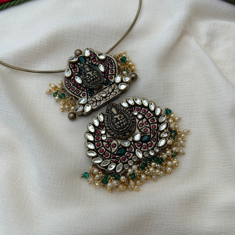 About the Product: This delicate piece of Shika is handcrafted to perfection.Your every moment deserves an elegance and we tune in. Terracotta neckwear with earrings in the charming antique gold with kundhan stone embellishments.The neckwear comes with a Hasli chain for the closure.