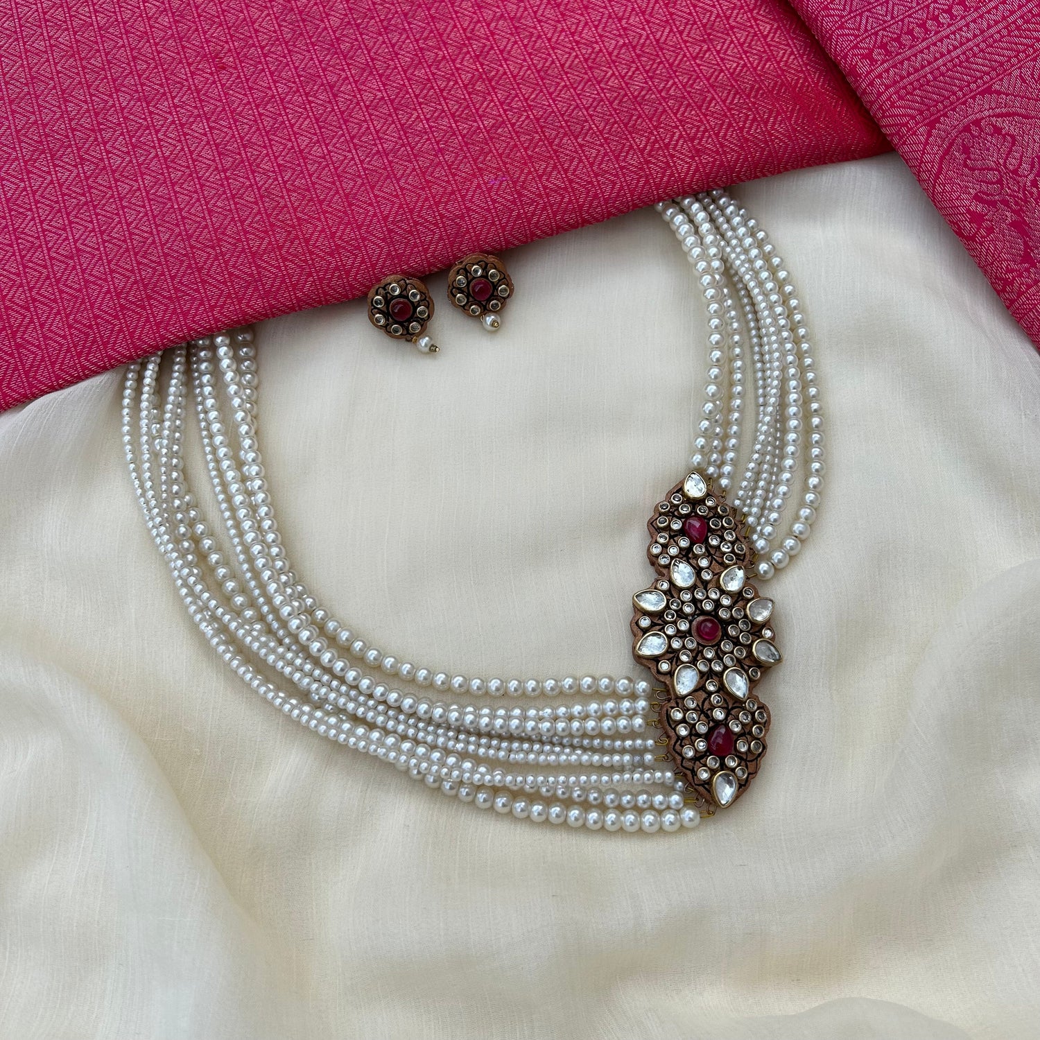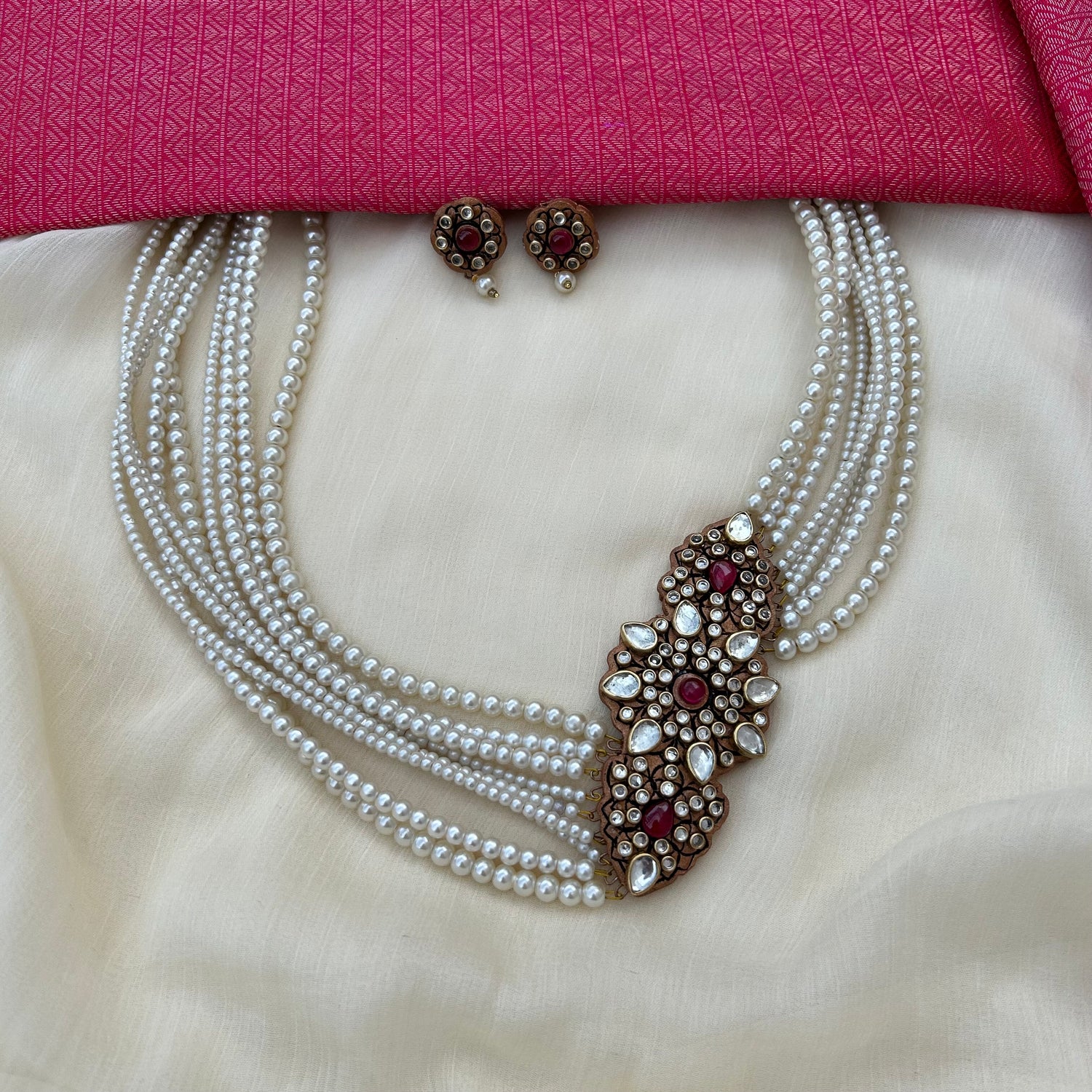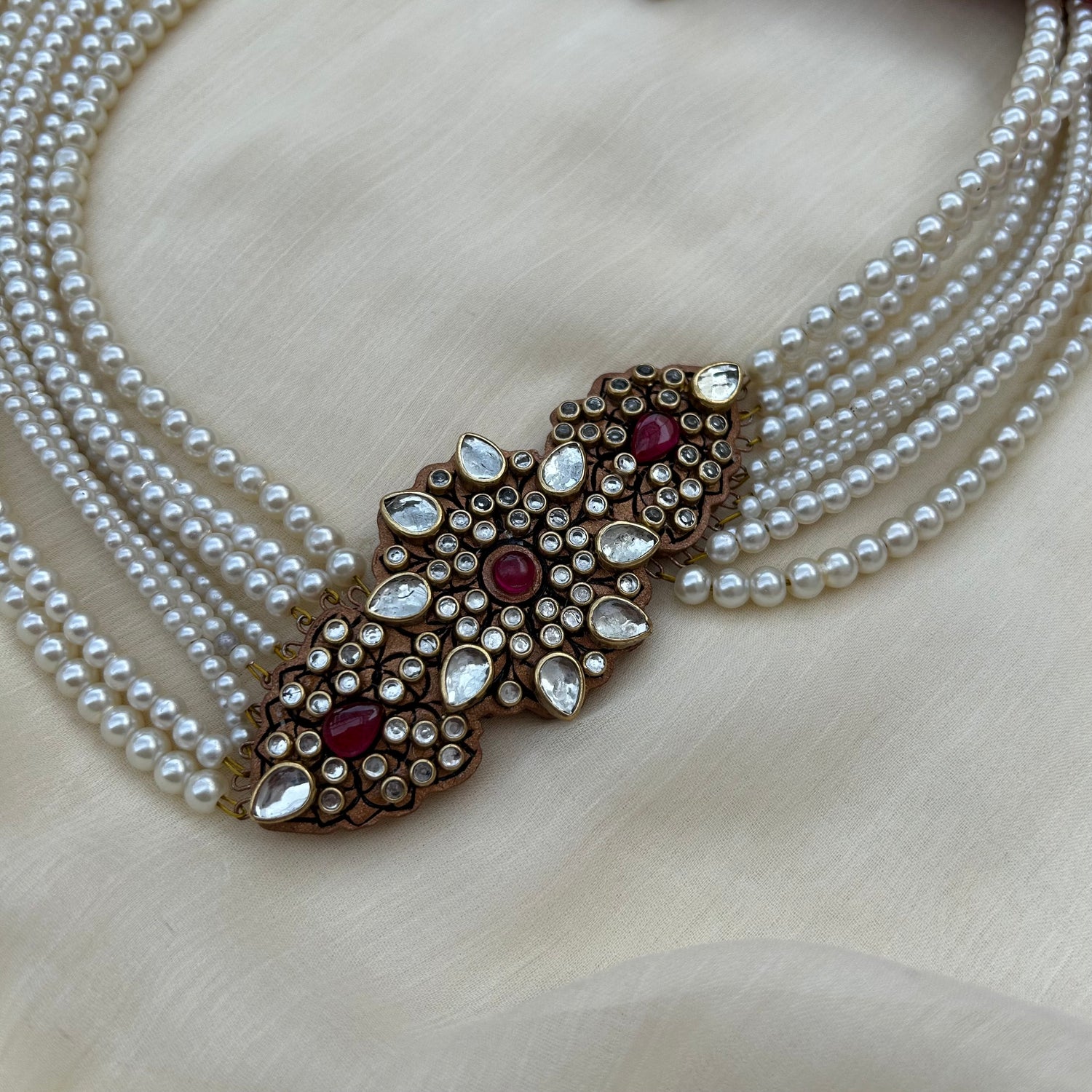 About the Product: This delicate piece of Shika is handcrafted to perfection.Your every moment deserves an elegance and we tune in. Terracotta neckwear with studs in the charming antique and pearls with kundhan stone embellishments.The neckwear comes with adjustable thread for the closure.