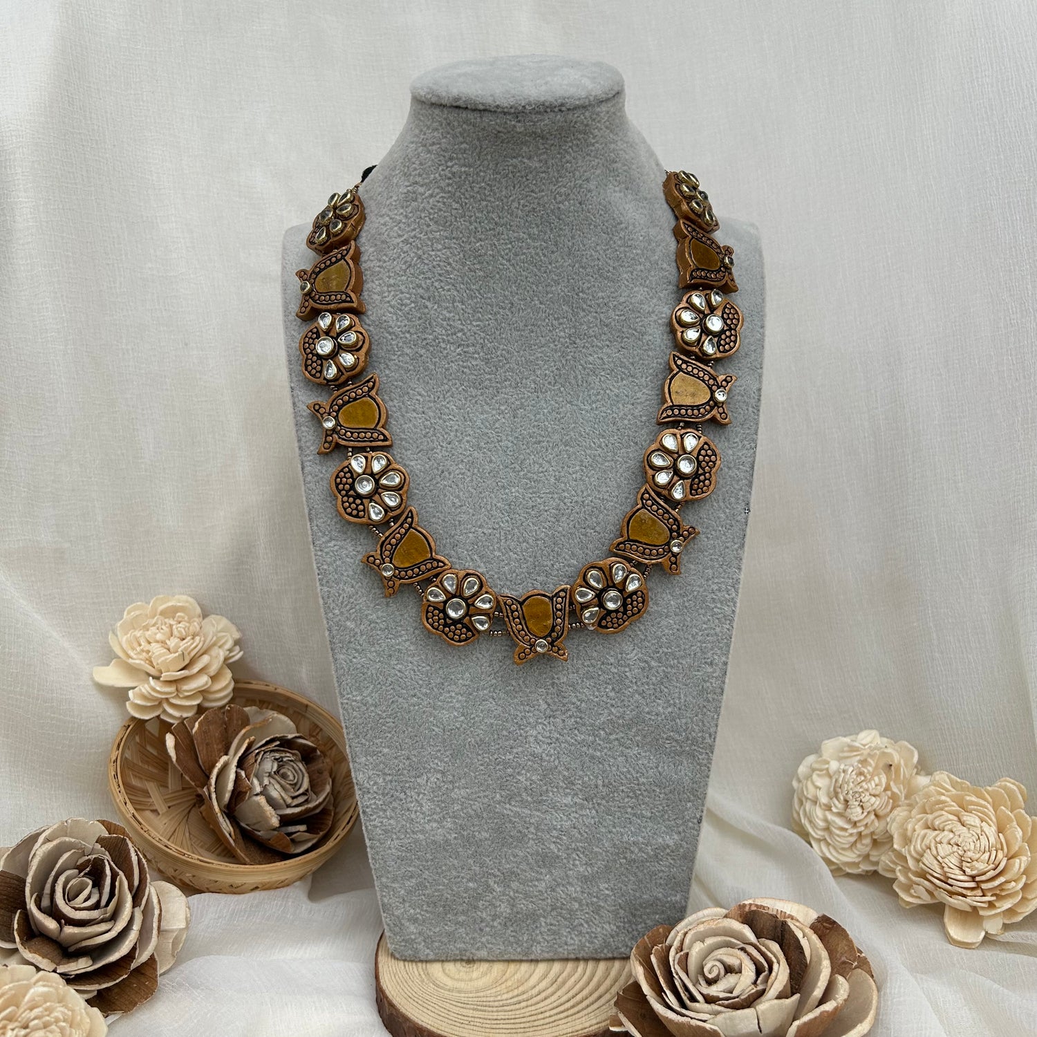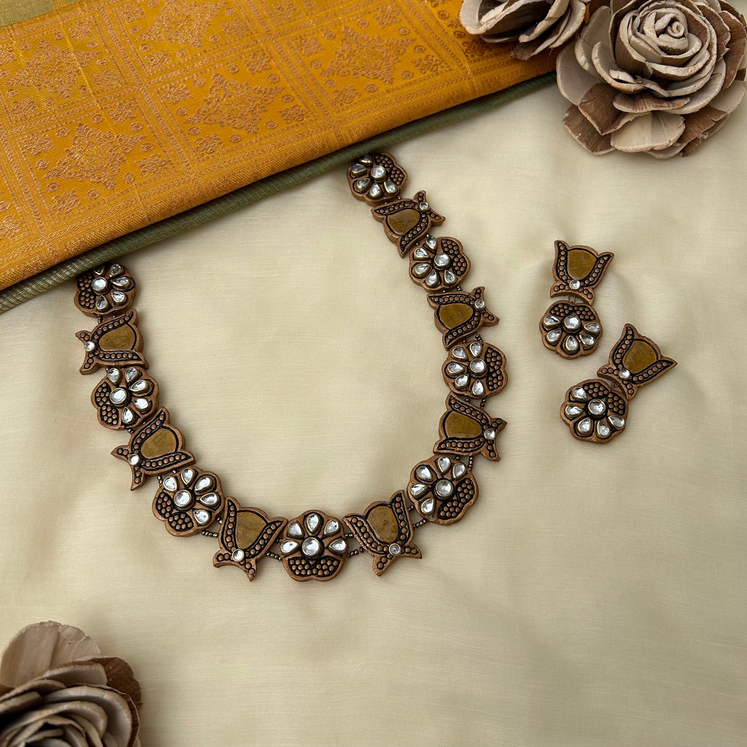 About the Product: This delicate piece of Shika is handcrafted to perfection.Your every moment deserves an elegance and we tune in. Terracotta neckwear with danglers in the endless red and gold shades with kundhan stone embellishments.The neckwear comes with adjustable thread for the closure.