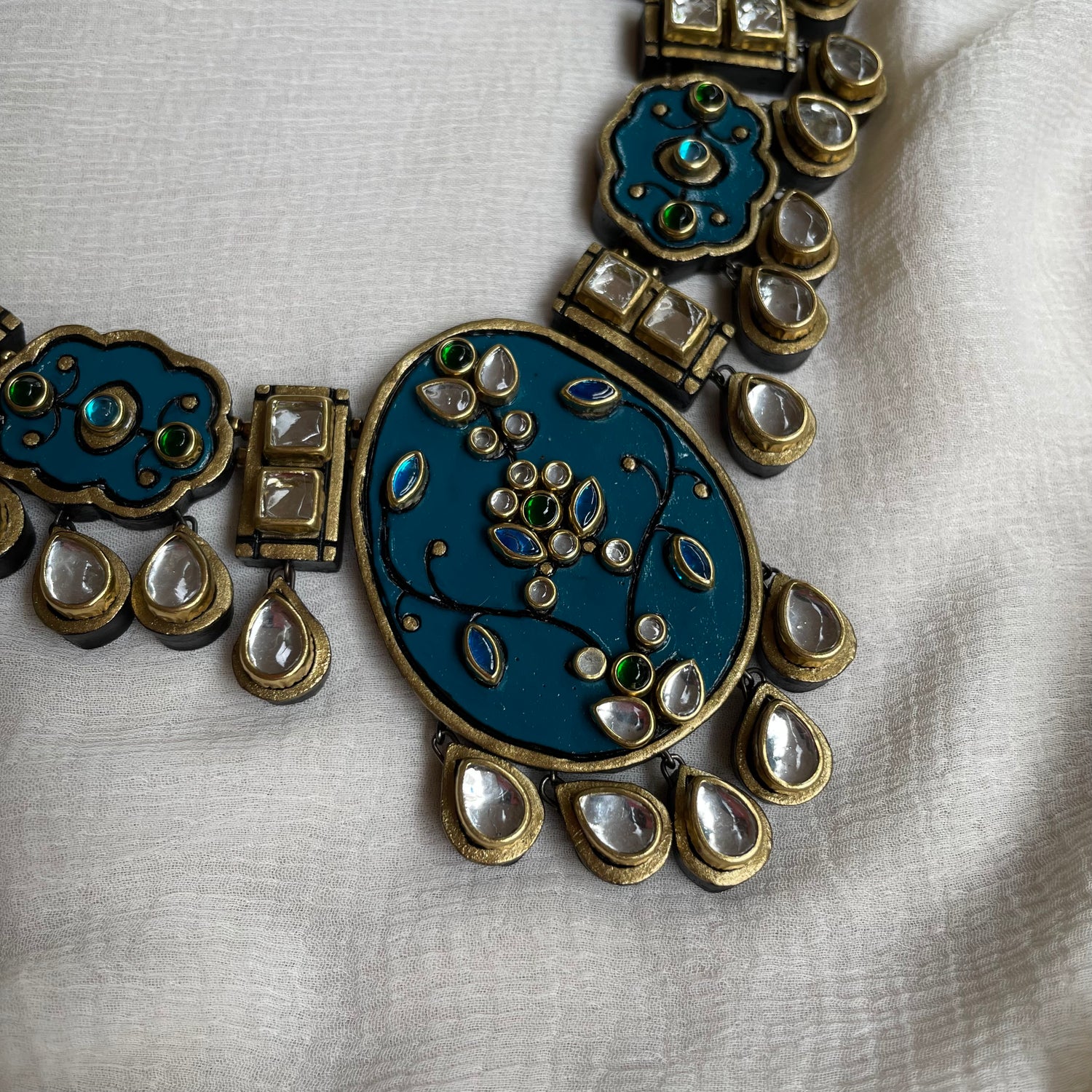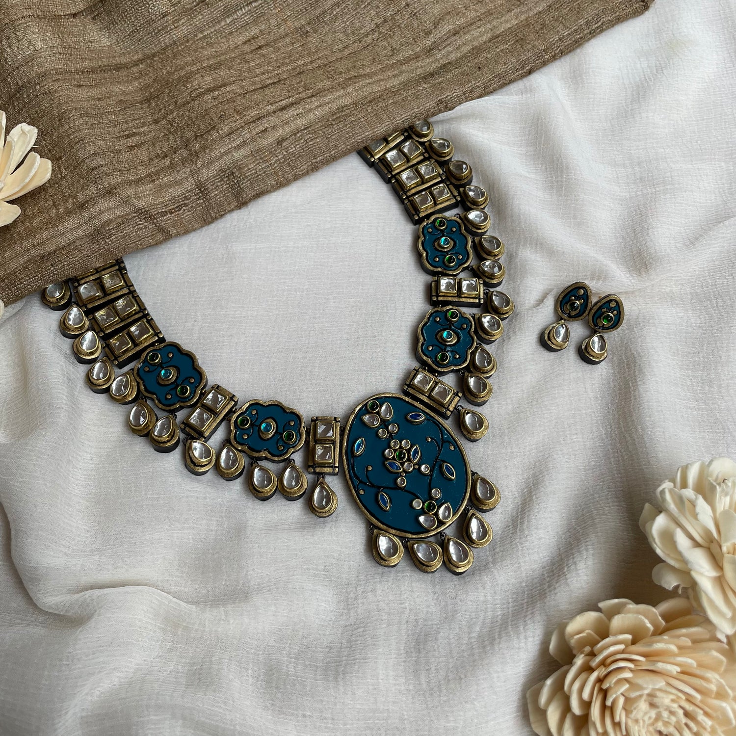 About the Product: This delicate piece of Shika is handcrafted to perfection.Your every moment deserves an elegance and we tune in. Terracotta neckwear with studs in the endless gold shades with kundhan stone embellishments.The neckwear comes with adjustable thread for the closure.