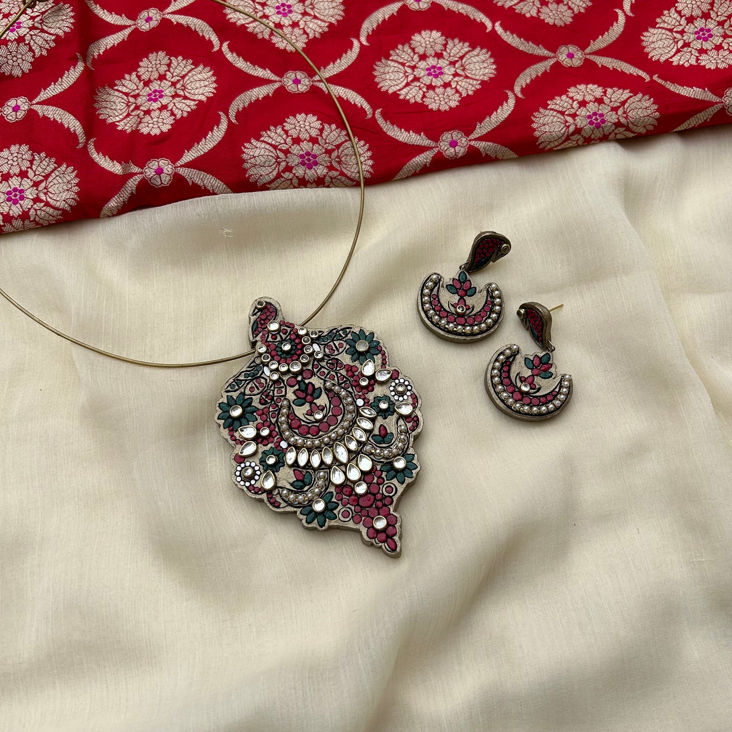 About the Product: This delicate piece of Shika is handcrafted to perfection.Your every moment deserves an elegance and we tune in. Terracotta neckwear with earrings  in the charming antique gold mogappu with kundhan stone embellishments.The neckwear comes with a Hasli chain for the closure.
