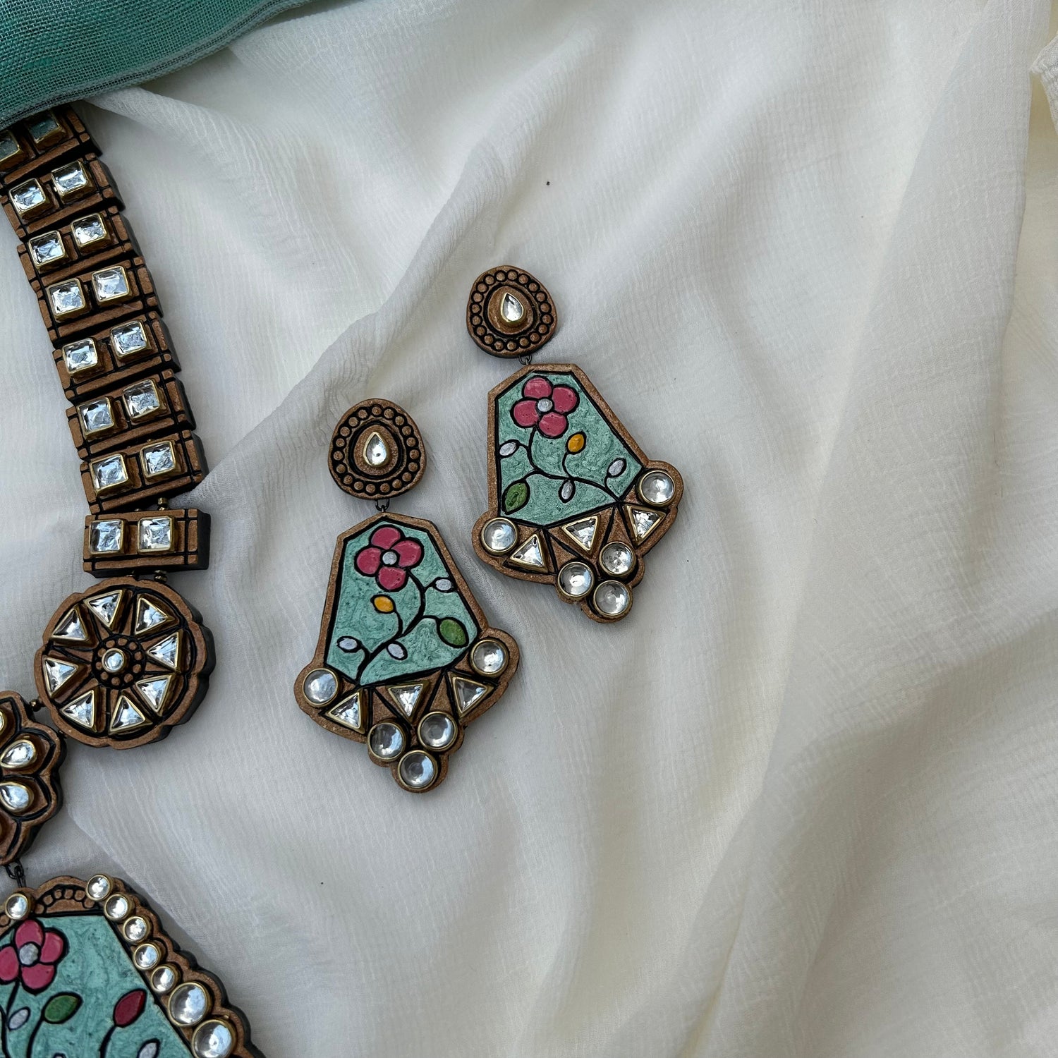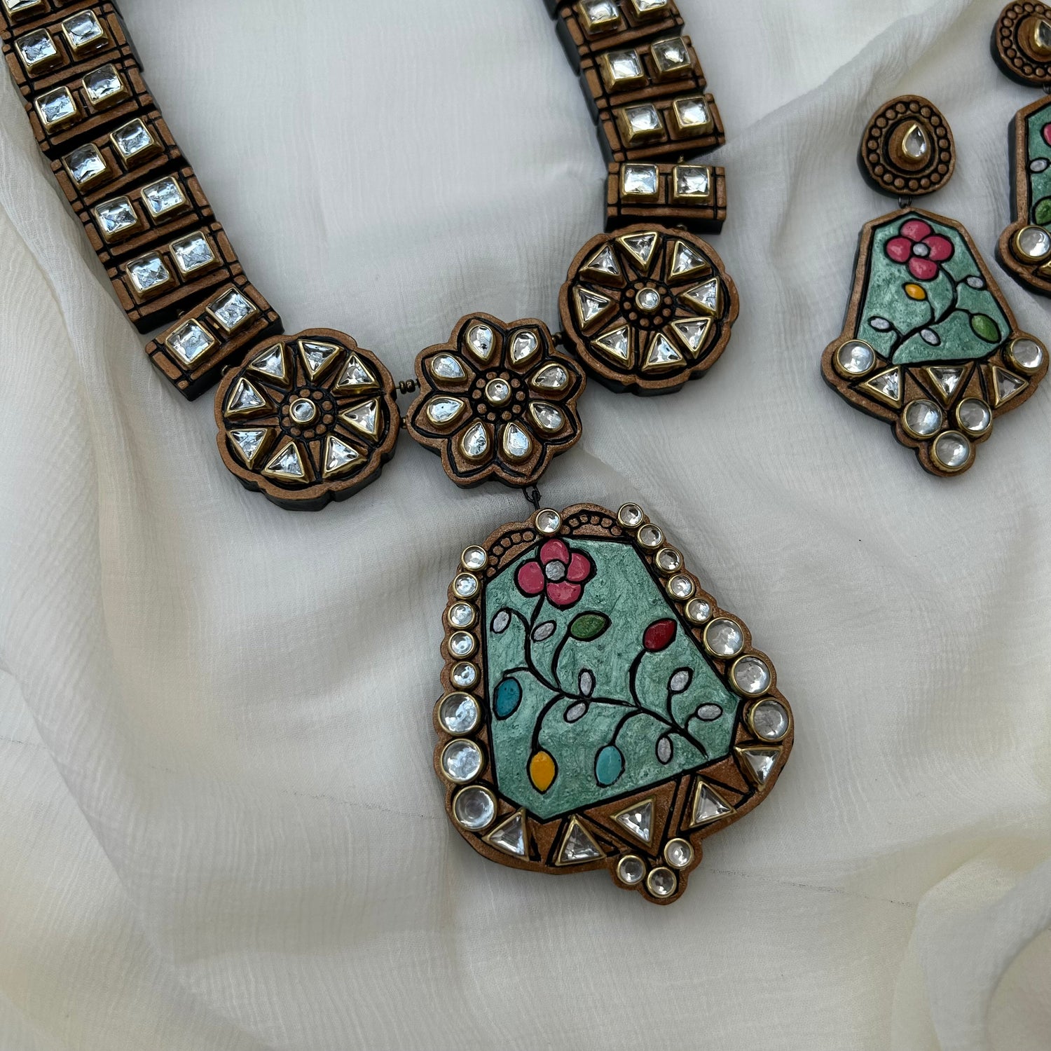 About the Product: This delicate piece of Shika is handcrafted to perfection.Your every moment deserves an elegance and we tune in. Terracotta neckwear with danglers in a golden wrap with Kundhan stones embellishments.The neckwear comes with adjustable thread for the closure.