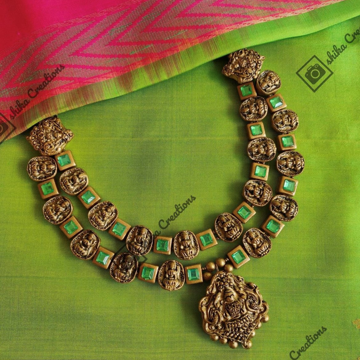 About the Product: Shika blended terracotta with kundhans to get a new stunning look for your outfit. What makes this more special is that this is completely handcrafted. Terracotta nagas neckwear and jhumkas with green kundhan stone embellishments. The neckwear comes with an adjustable chain for the closure.