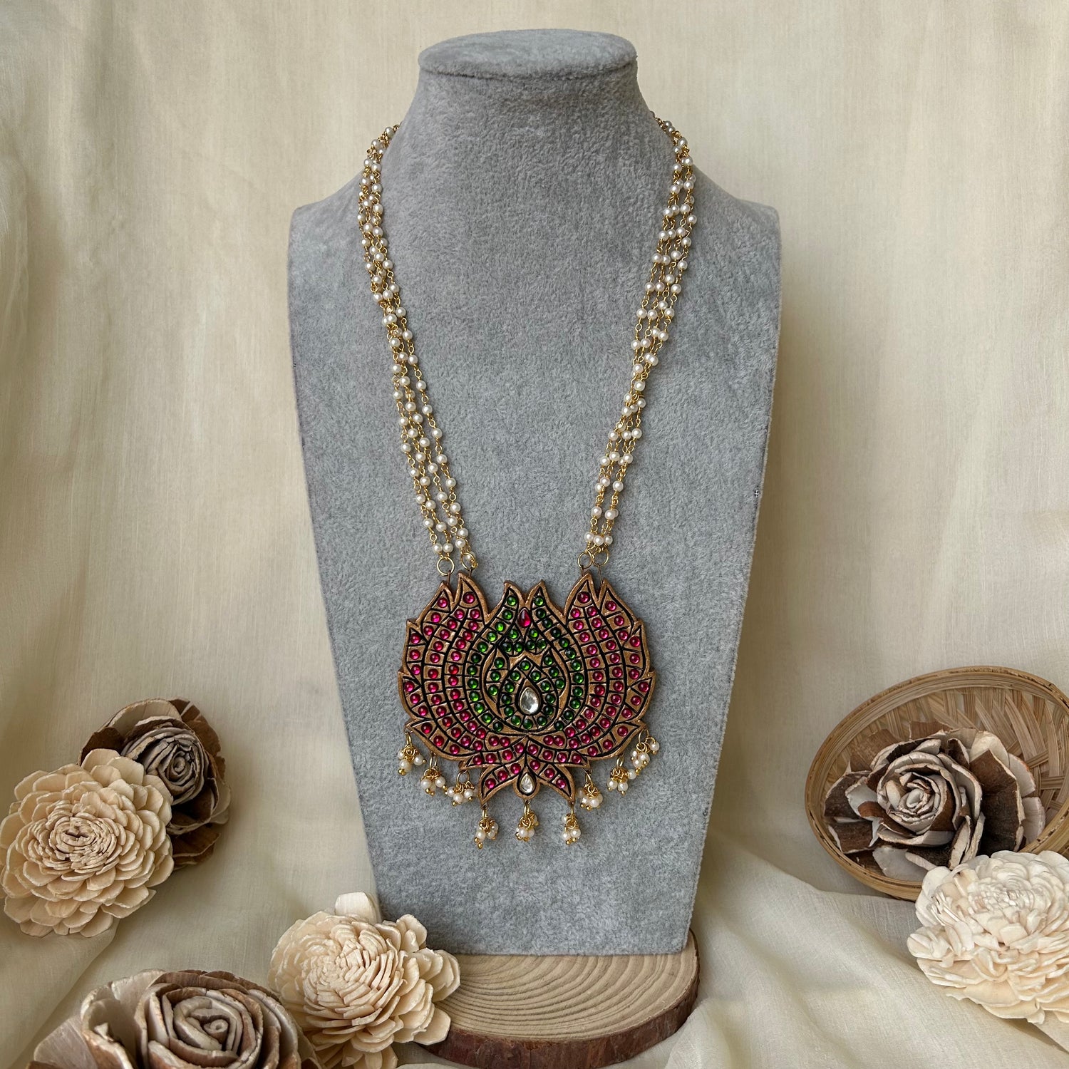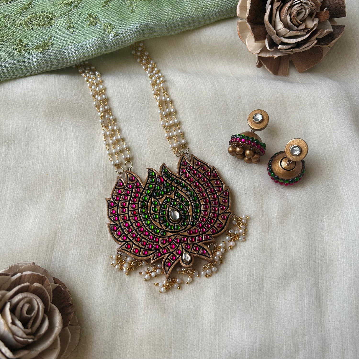 About the Product: This delicate piece of Shika is handcrafted to perfection.Your every moment deserves an elegance and we tune in. Terracotta lotus neckwear with studs in pink and green shades in a golden wrap.The neckwear comes with adjustable thread for the closure.