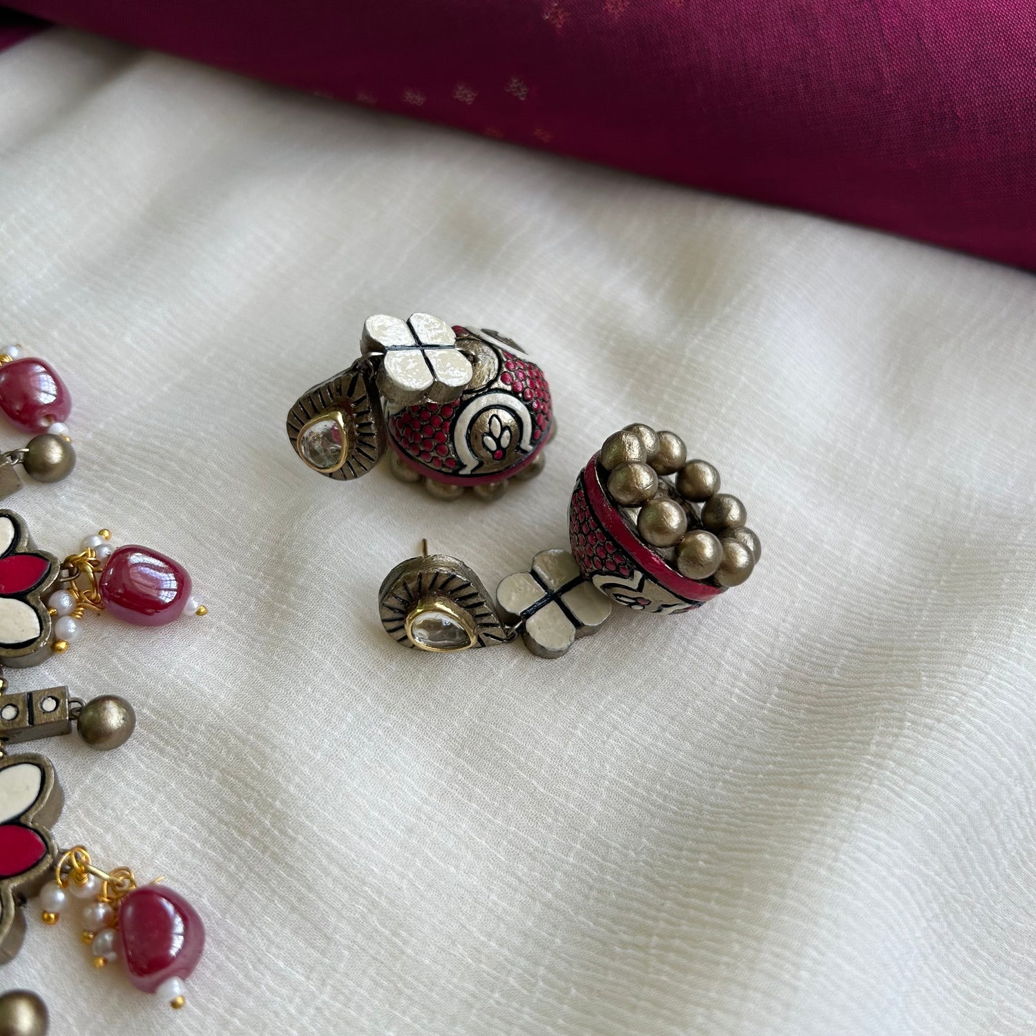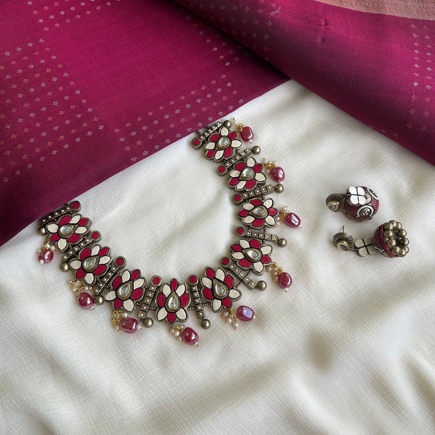About the Product: This delicate piece of Shika is handcrafted to perfection.Your every moment deserves an elegance and we tune in. Terracotta neckwear with jhumkas in the charming antique and pink hues with kundhan stone embellishments.The neckwear comes with adjustable thread for the closure.