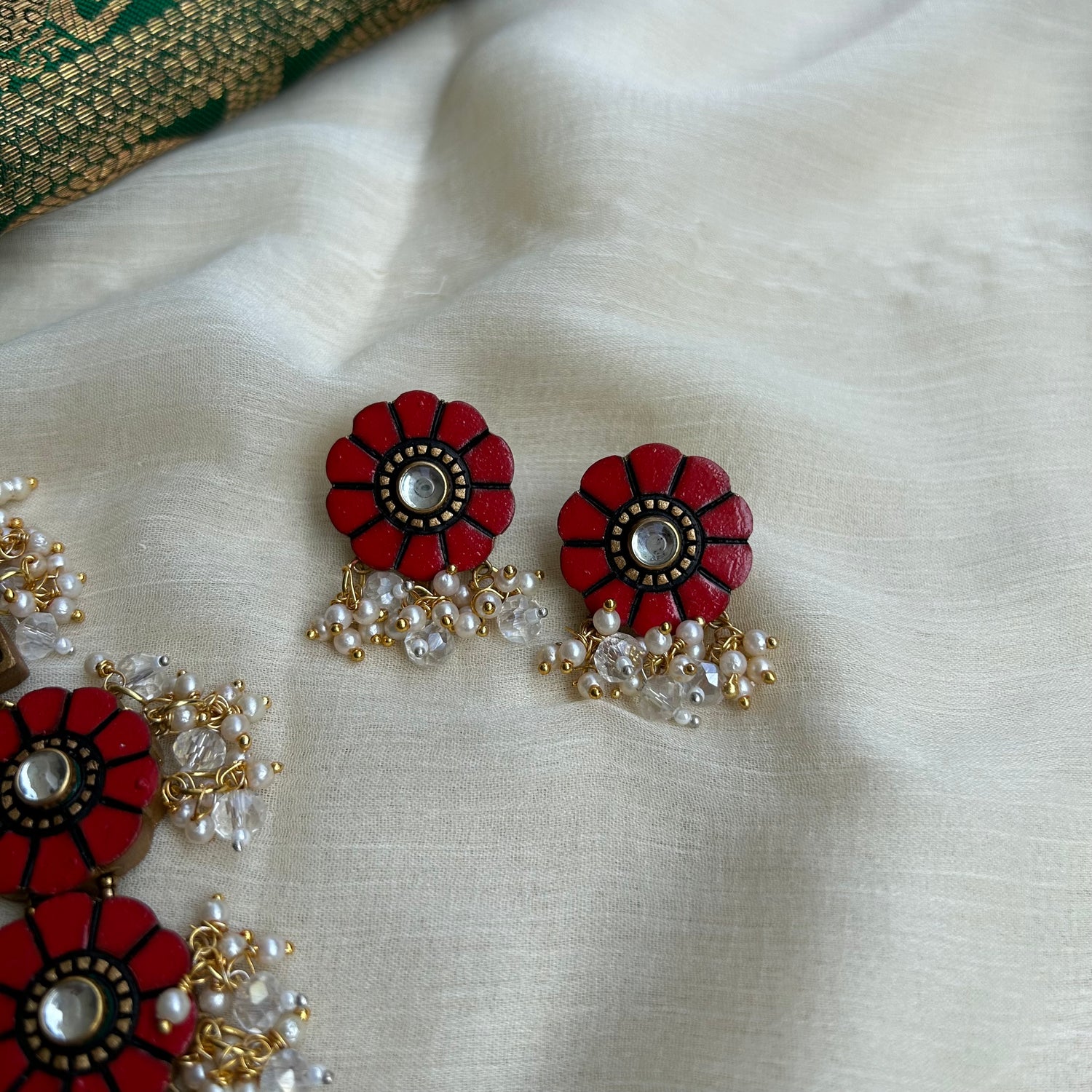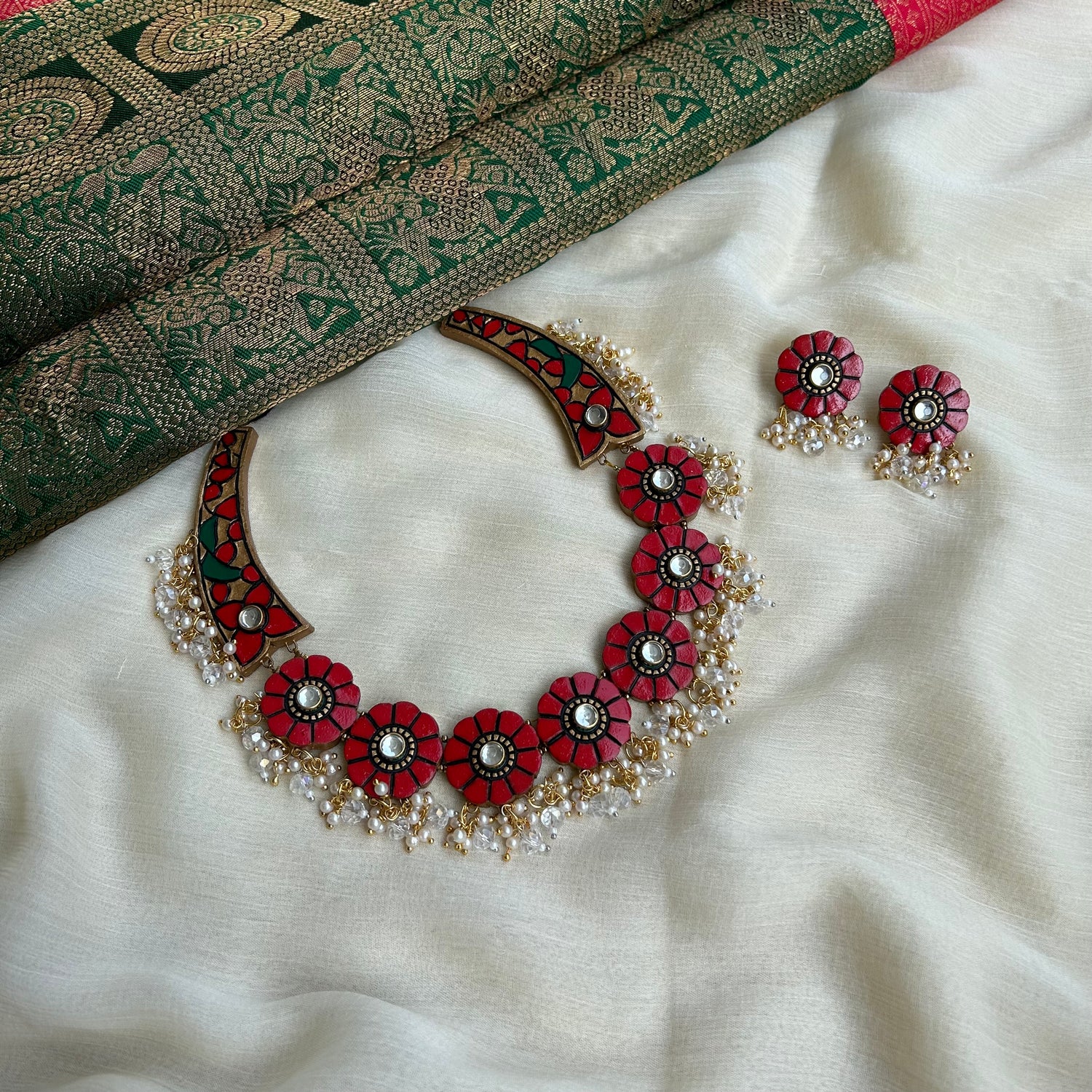 About the Product: This delicate piece of Shika is handcrafted to perfection.Your every moment deserves an elegance and we tune in. Terracotta neckwear with studs in the charming green and red shades with kundhan stone embellishments.The neckwear comes with adjustable thread for the closure.
