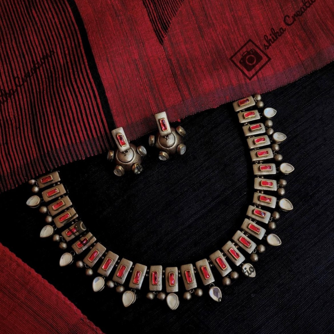 About the Product: Shika blended terracotta with kundhans to get a new stunning look for your outfit. What makes this more special is that this is completely handcrafted. Terracotta neckwear and jhumkas with red and white kundhan stone embellishments. The neckwear comes with adjustble dori for the closure.