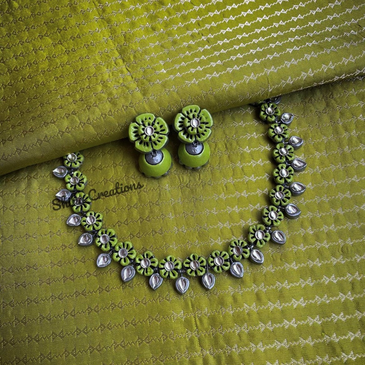 About the Product: Shika blended terracotta with kundhans to get a new stunning look for your outfit. What makes this more special is that this is completely handcrafted. Terracotta floral neckwear and jhumkas with kundhan stone embellishments. The neckwear comes with adjustble chain for the closure.