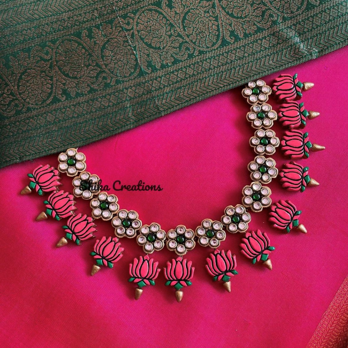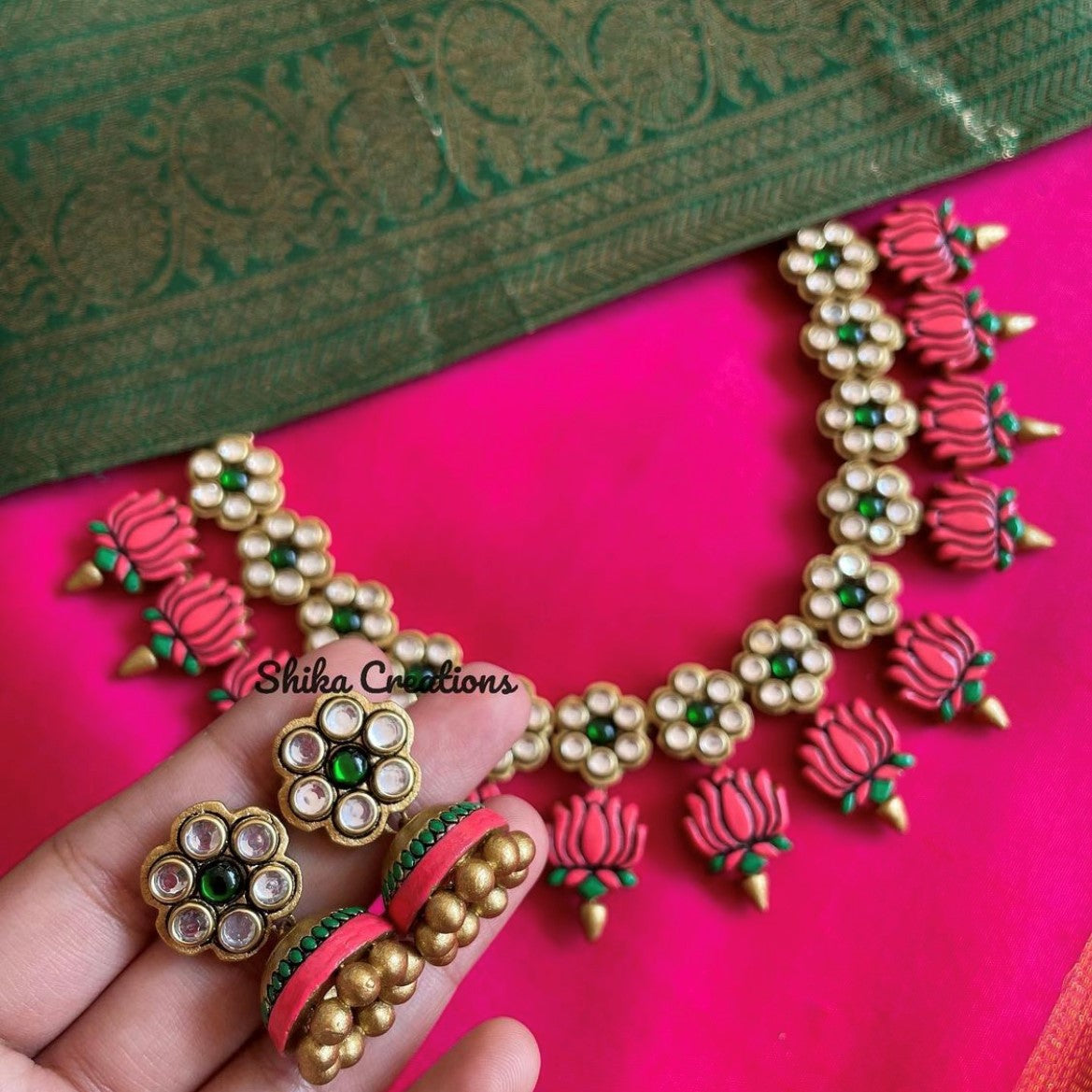 About the Product: Shika blended terracotta with kundhans to get a new stunning look for your outfit. What makes this more special is that this is completely handcrafted. Terracotta lotus neckwear and jhumkas with kundhan stone embellishments. The neckwear comes with adjustble chain for the closure.