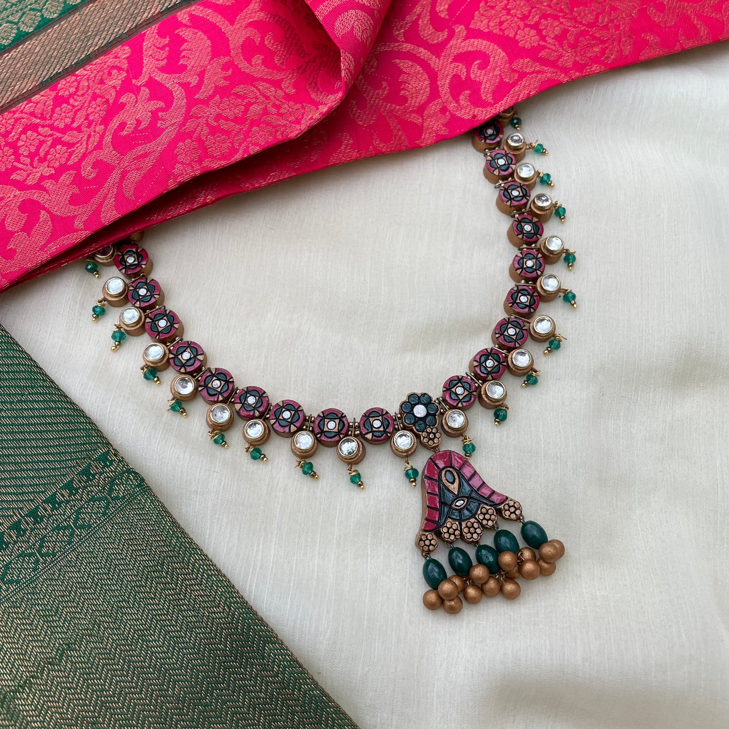 About the product - Signatures of Shika! Terracotta neckwear in stunning hues with kundhan stone embellishments . It is paired with studs. The set comes with an adjustable thread for the closure.