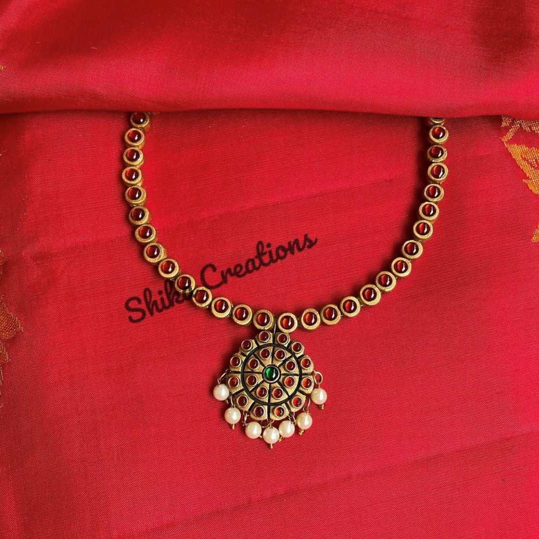 About the Product: Shika blended terracotta with kundhans to get a new stunning look for your outfit. What makes this more special is that this is completely handcrafted. Terracotta traditional neckwear with red and green kundhan stone embellishments and Dangling pearls. The neckwear comes with adjustble chain for the closure.