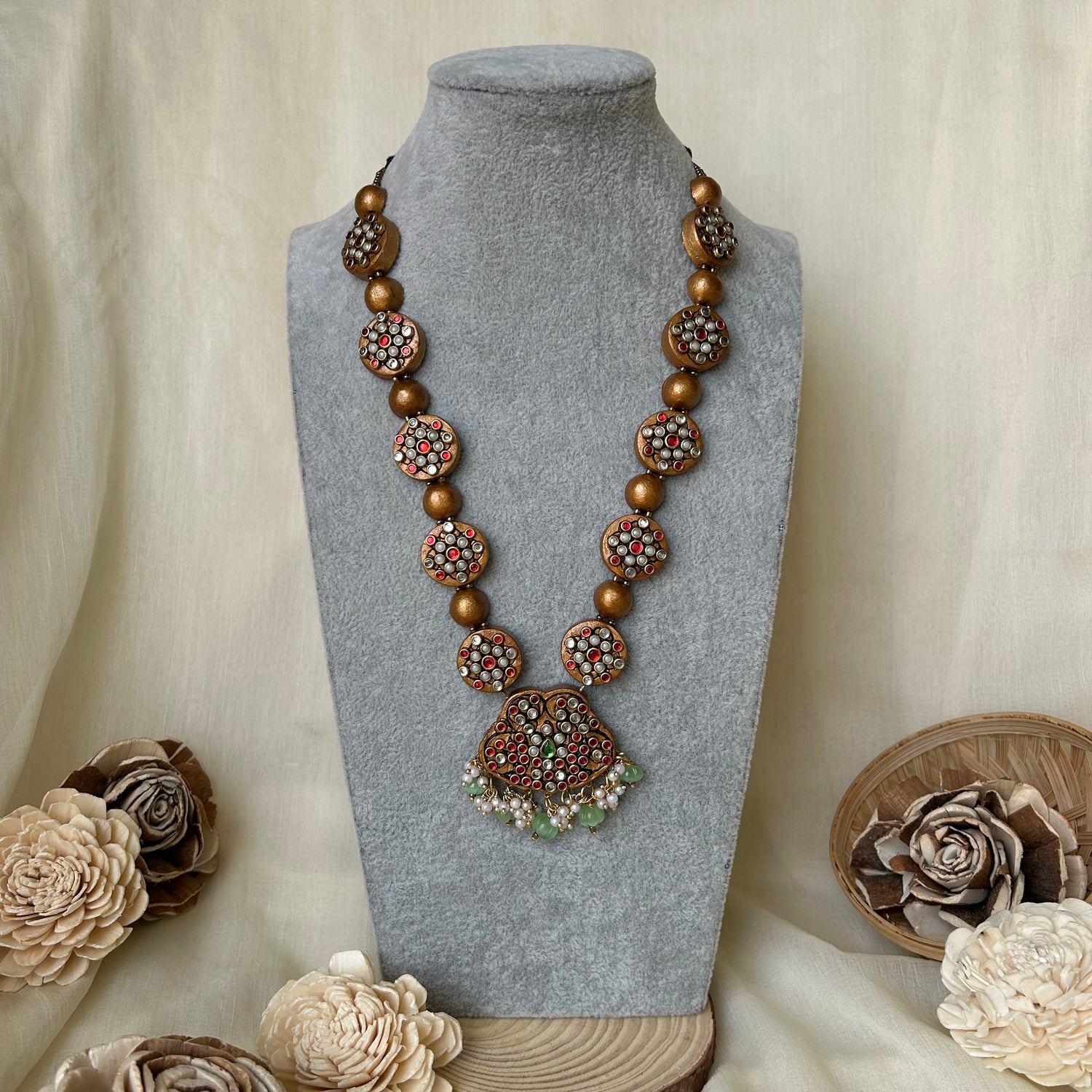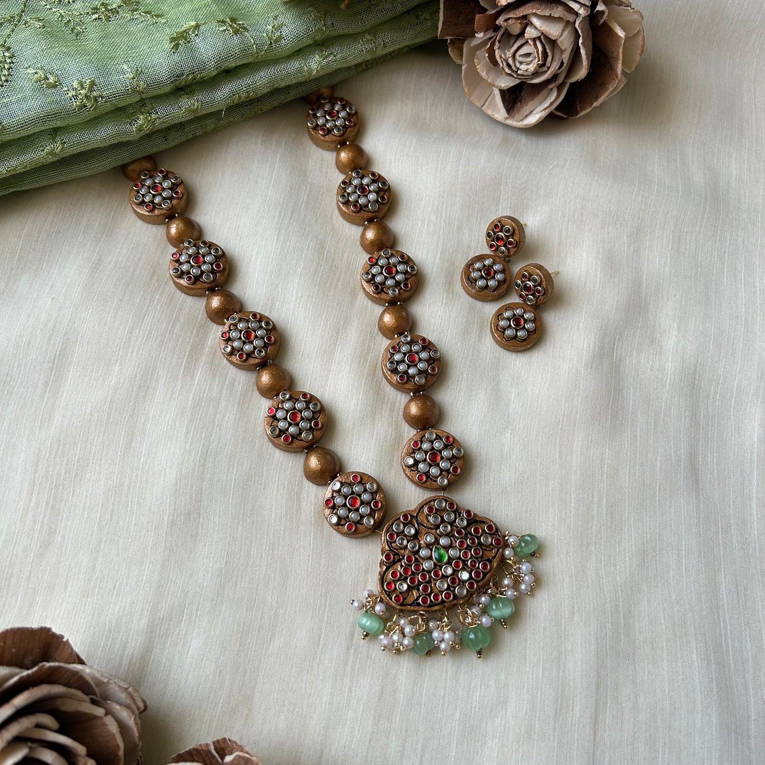 About the Product: This delicate piece of Shika is handcrafted to perfection.Your every moment deserves an elegance and we tune in. Terracotta neckwear with danglers in the endless red and green with gold shades with kundhan stone embellishments.The neckwear comes with adjustable thread for the closure.