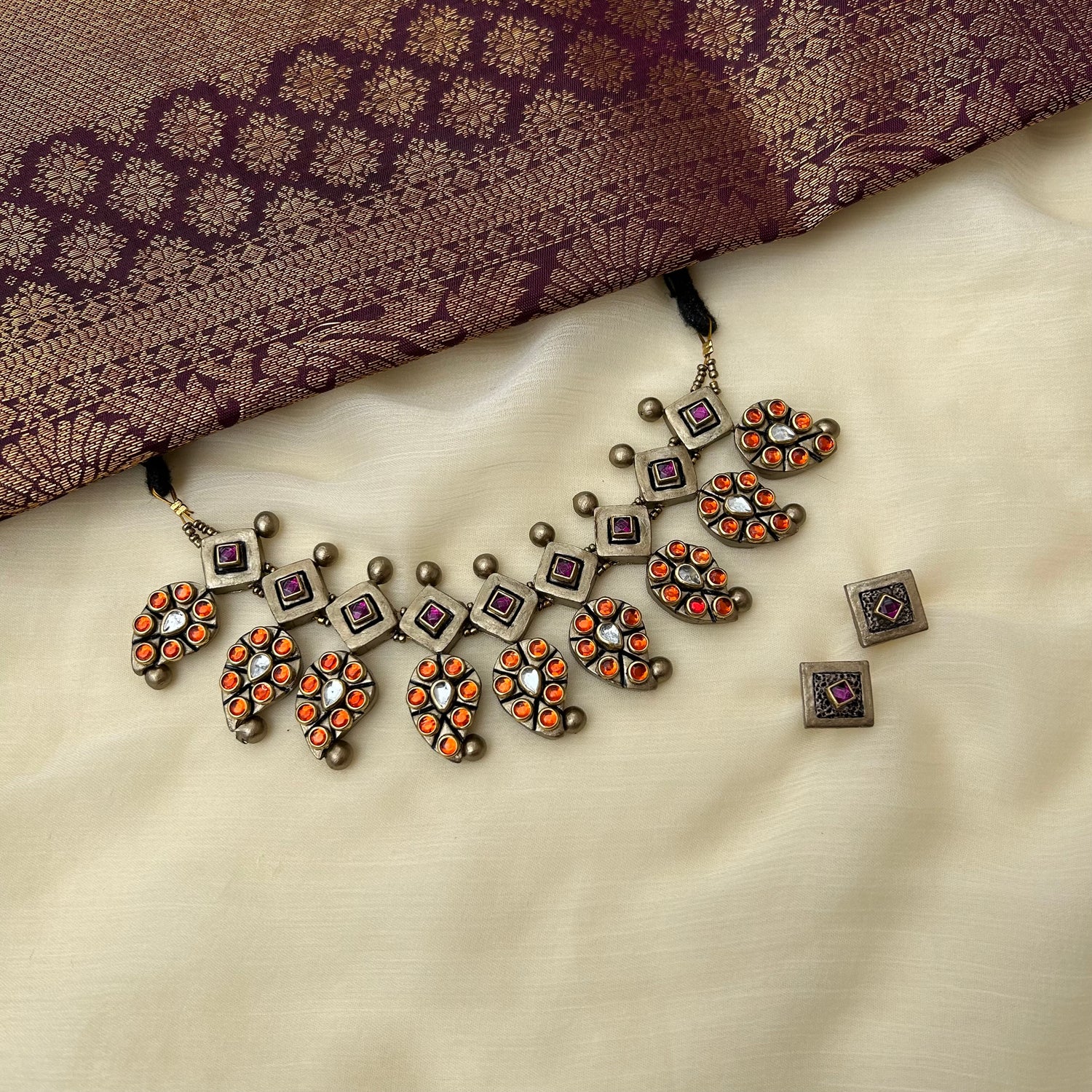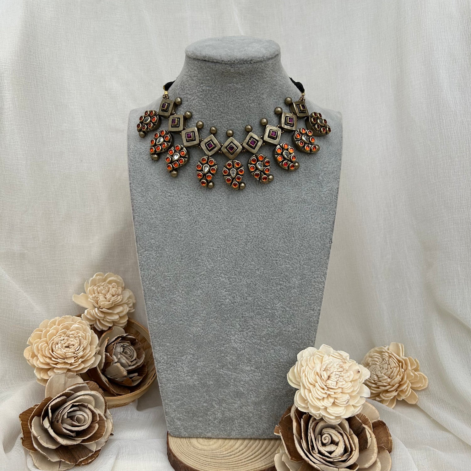 About the product - Signatures of Shika! Terracotta neckwear in stunning gold hues with kundhan stone embellishments . It is paired with studs. The set comes with an adjustable thread for the closure.