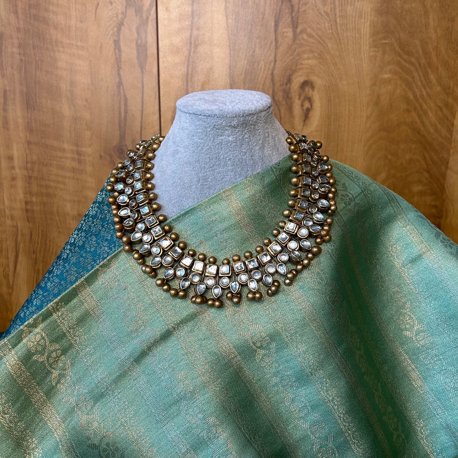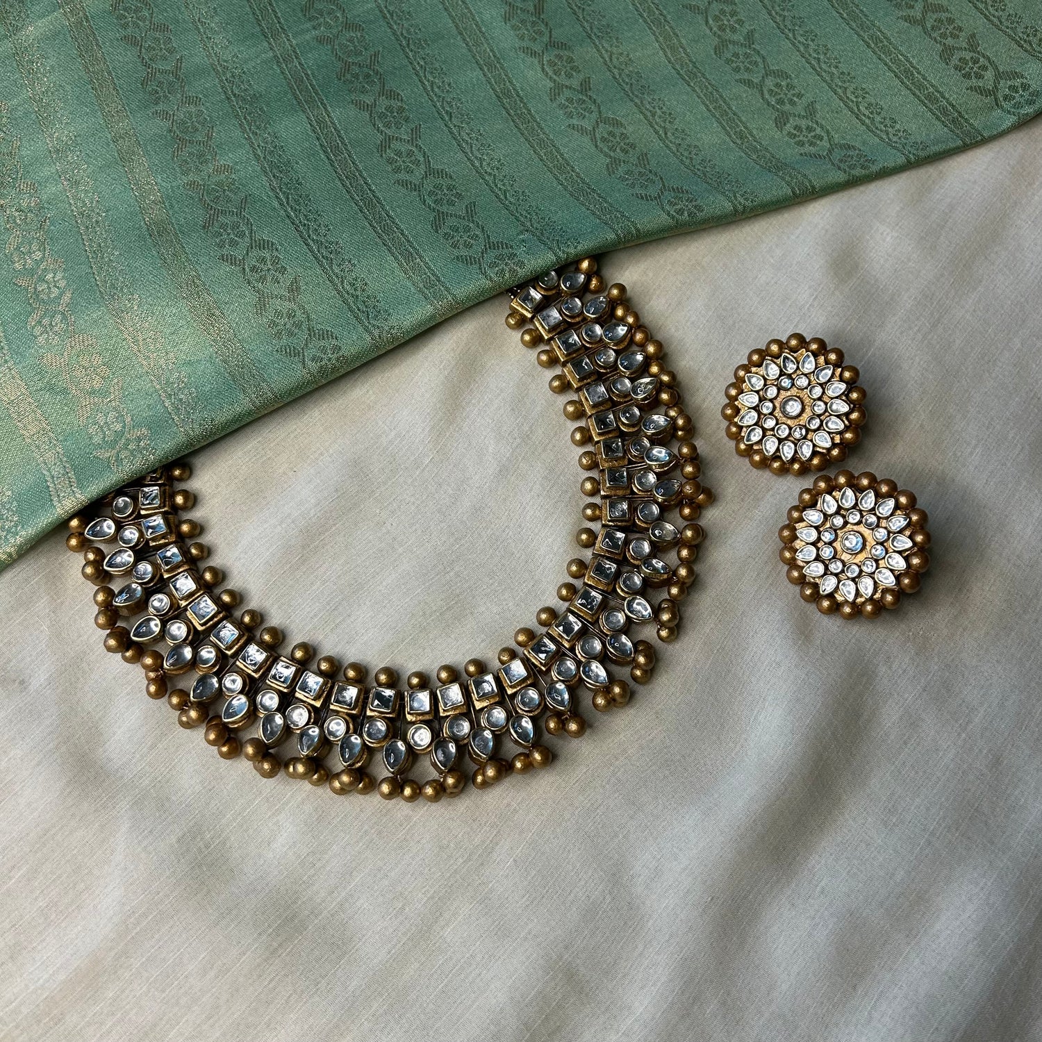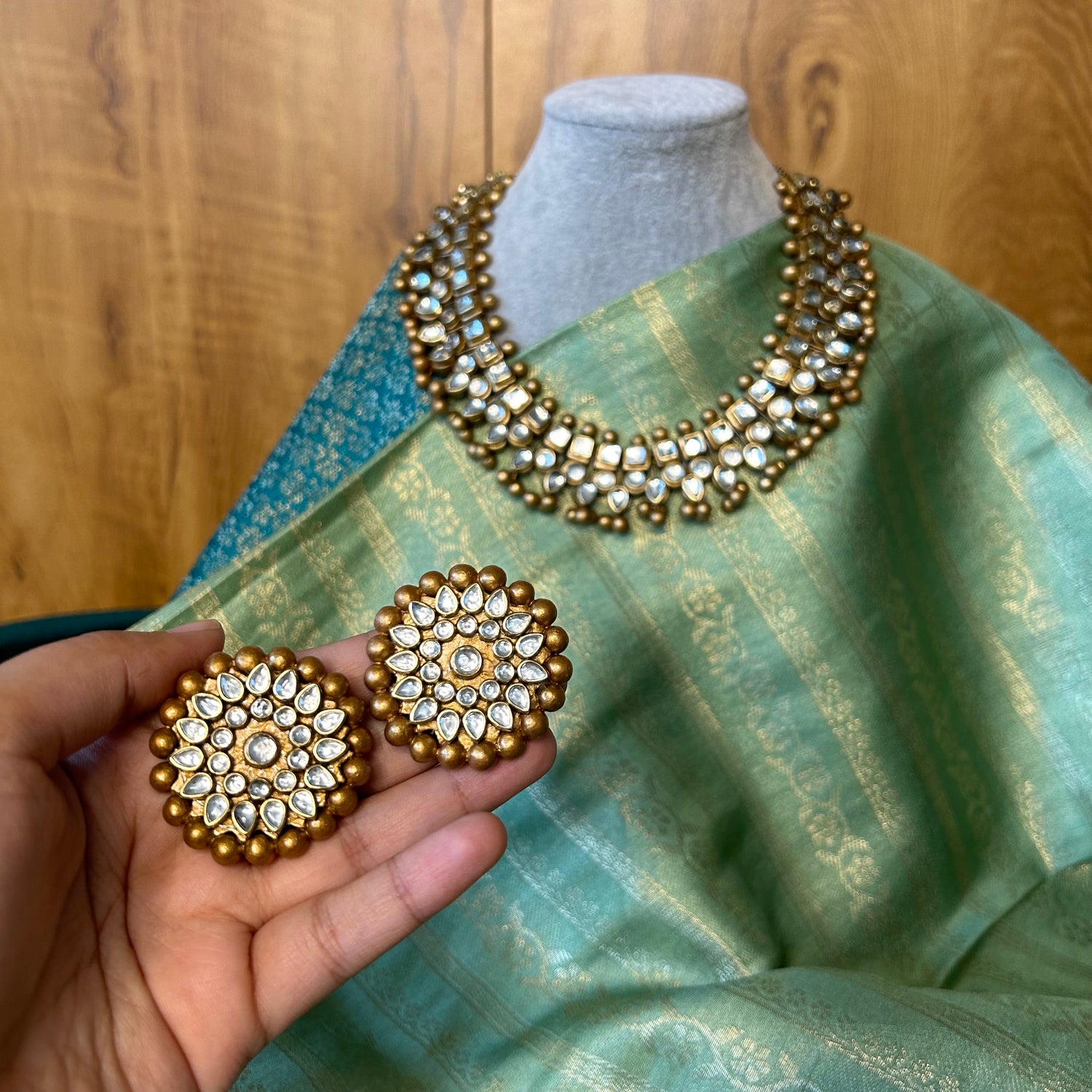About the Product: Shika blended terracotta with kundhans to get a new stunning look for your outfit. What makes this more special is that this is completely handcrafted. Terracotta neckwear and studs with kundhan stone embellishments to suit to any ethnic and traditional outfit. The neckwear comes with adjustble chain for the closure.